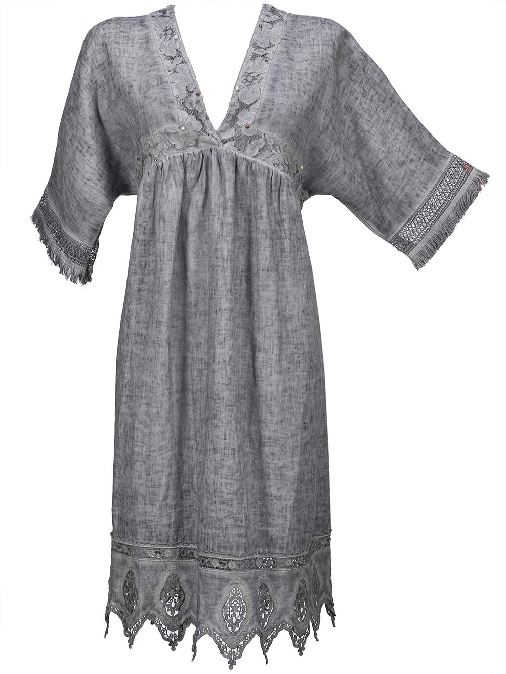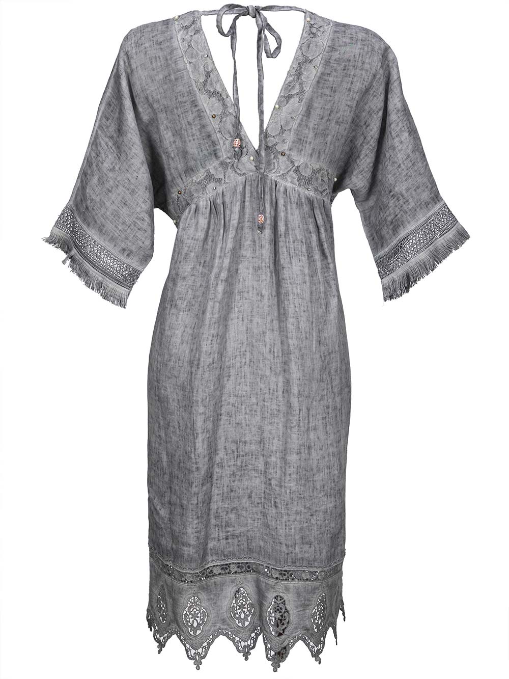 Abito/kaftano mare/città donna grigio sfumato effetto maltinto, ricco scollo sul davanti e sul dietro, laccetto regolabile sulla parte dietro antiscivolo, manica calata con balza pizzo e frange, taglio mezzo seno tutto arricciato rifinito insieme allo scollo con pizzo e perline, lunghezza sotto il ginocchio rifinito con ricca balza di pizzo a punte su tono.
