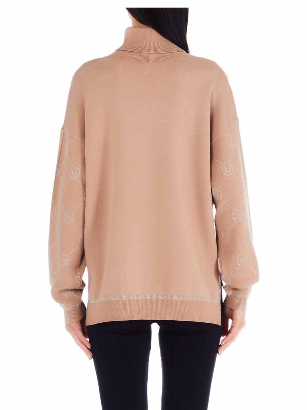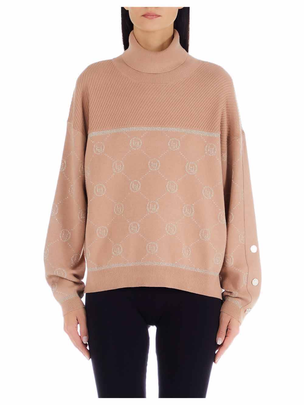 Maglia donna color beige rosato/cipria in viscosa rasata pesante, collo alto rovesciato, manica calata più bottoni gioiello oro sulla manica sinistra. Il tessuto delle maniche e della parte davanti è rasato con lavorazione geometrica più loghi in lurex dorato stile Gucci. Parte spalle e tutto il retro è tinta unita. Il fondo è asimmetrico con spacchetti laterali, più lunga sul dietro.