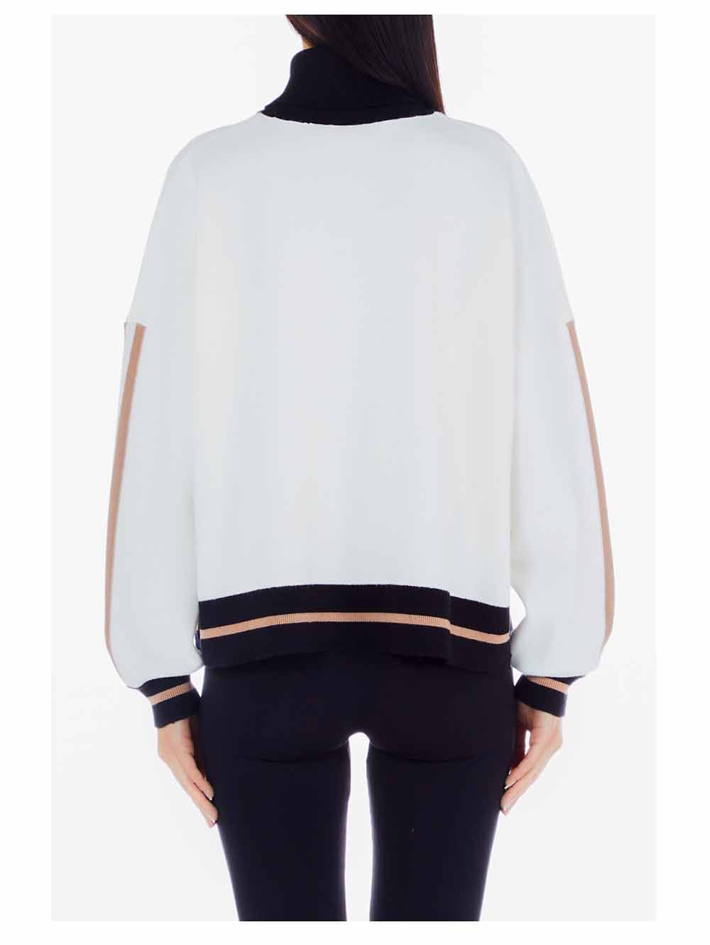 Maglia donna bicolor in jersey pesante di viscosa rasato stile maglia stoffa. Lupetto a risvolto nero, come fondo maniche e maglia. Tutto il resto della maglia è bianco panna con logo centrale in micropaillettes oro rosato/argento, spalla calta stile anni ’80, forma over dritta sul fondo.