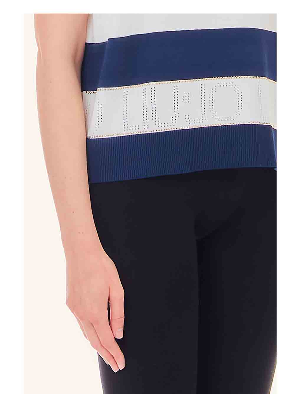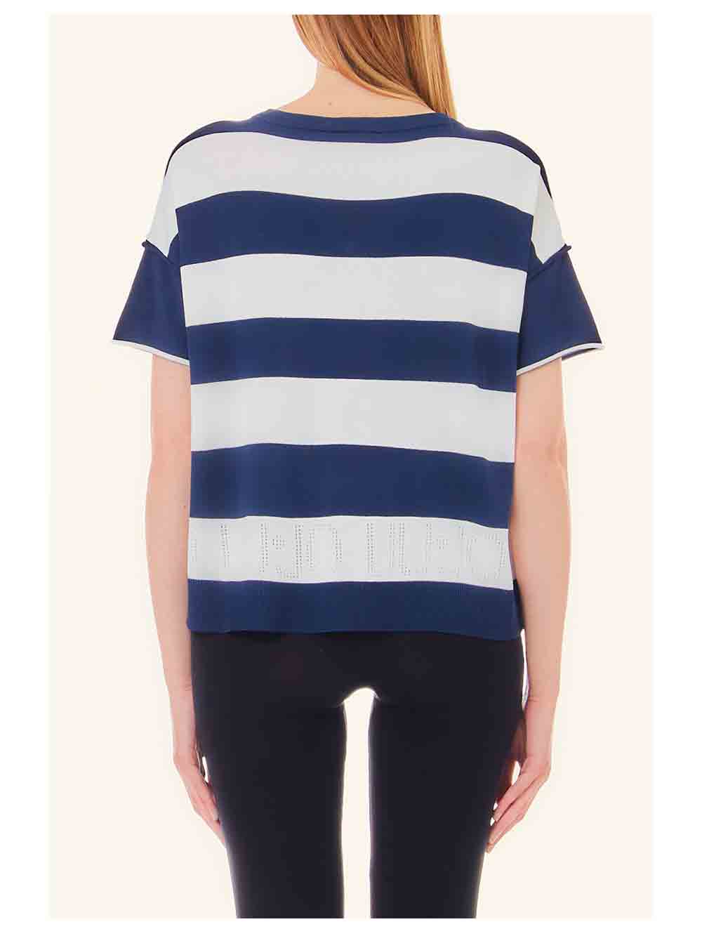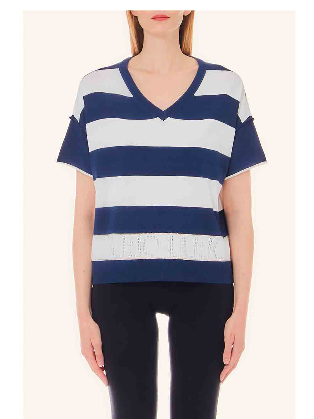 Maglia donna stile tricot bicolor blu/bianca panna in corposa e cascante viscosa, scollo a V contenuto, manica calata stile anni 80, tutto il davanti e dietro a righe orizzontali, le maniche blu unito. Sul fondo ultima fascia bianca panna logata in traforo più doppia applicazione di strass metallici argentati molto luminosi.