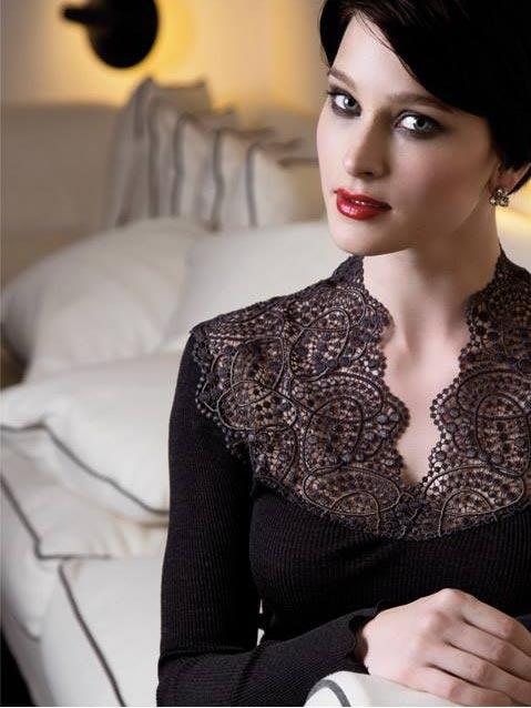 descrizione: Maglia Oscalito con scollo a V in pizzo pregiato ( lavorazione macramè) con intarsi in lurex, lavorazione a costina del tessuto pregiato , consistenza leggera e morbida sulla pelle, avvolge senza stringere.