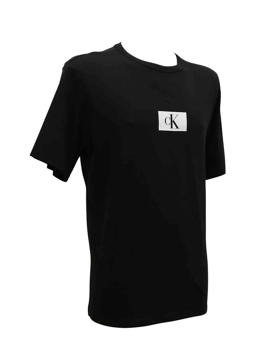 Maglia esternabile uomo nera in puro cotone mano corposa, mezza manica, girocollo, sul davanti logo centrale bianco gommato con “CK” nero, no stiro, veste una taglia in più.