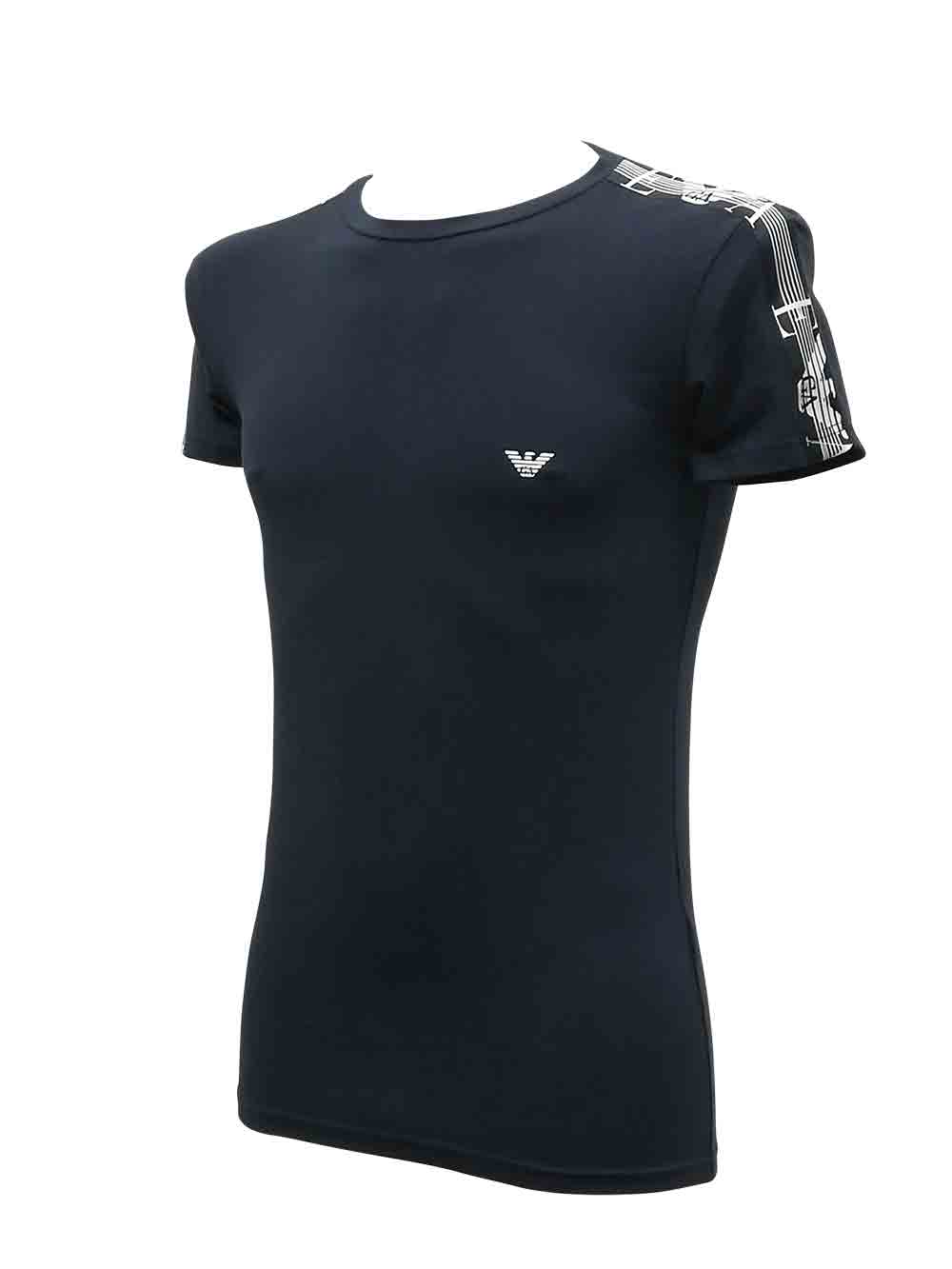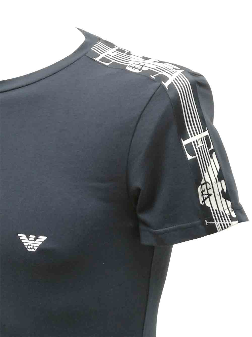 Maglia esternabile blu scuro uomo in morbido cotone elasticizzato, mezza manica, girocollo, linea aderente slim-fit, sulla spalla, dal collo al fondo manica, applicazione di nastro rigido opaco stile raso con logo e aquilotto bianchi a contrasto.