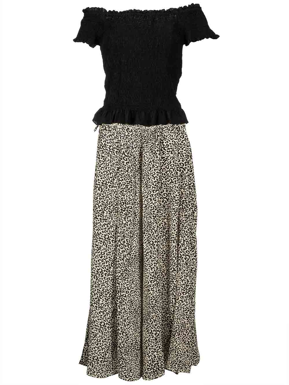 Maglietta nera donna in morbido tessuto tutto arricciato effetto anni ’80, scollo taglio pari spalle nude, mezza manichina, dritta e cortina con rouches finale.