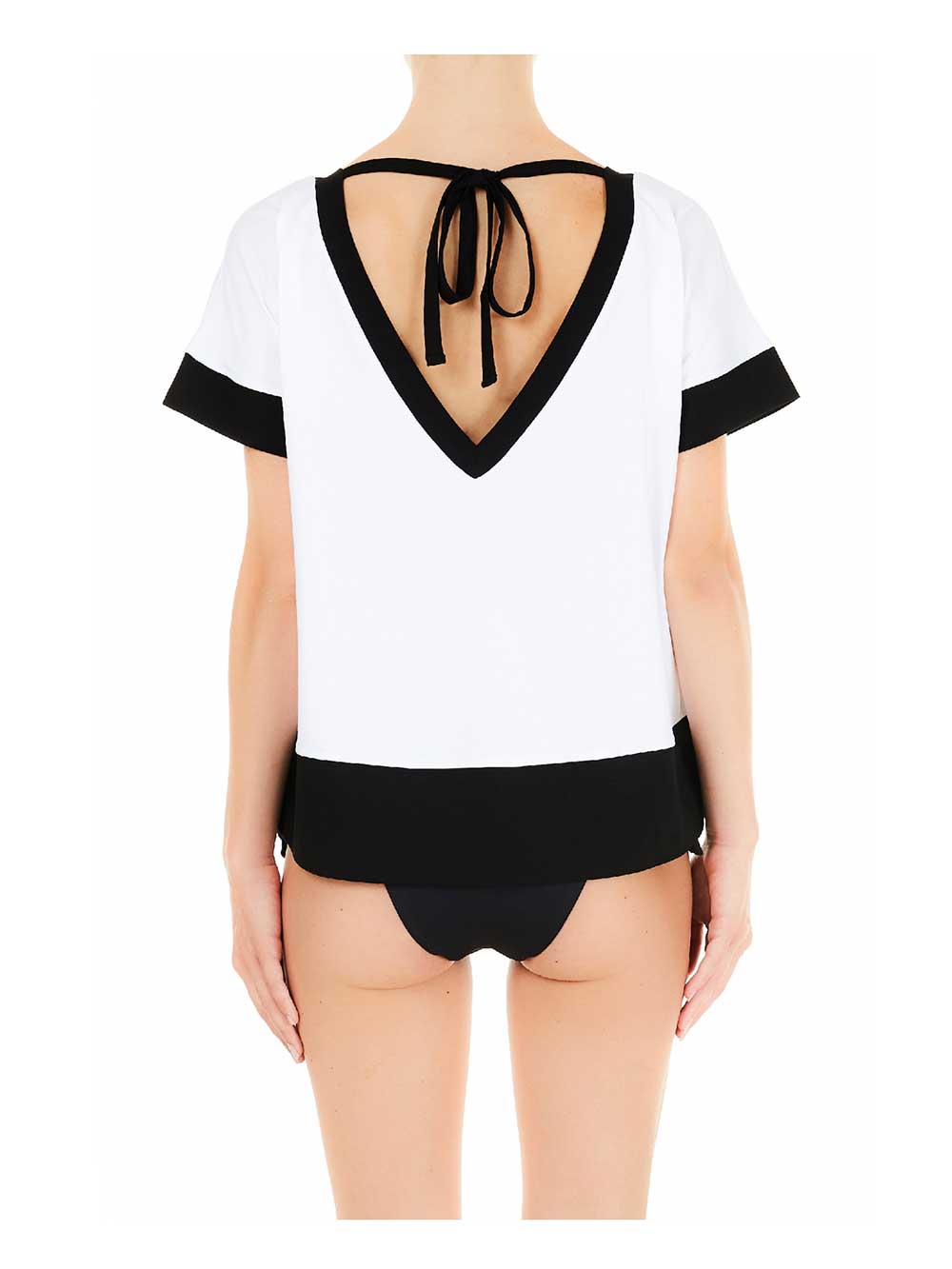 Maglietta donna bianca in morbido cotone elasticizzato cascante, scollo rotondo sul davanti, scollo a V fondo sul dietro con fiocco regolabile, mezza manica calata, stampa centrale + logo in strass metallici luminosi, forma over, fondo stondato più lungo dietro con fascione nero a contrasto, fondo maniche e bordo scolli neri a contrasto.