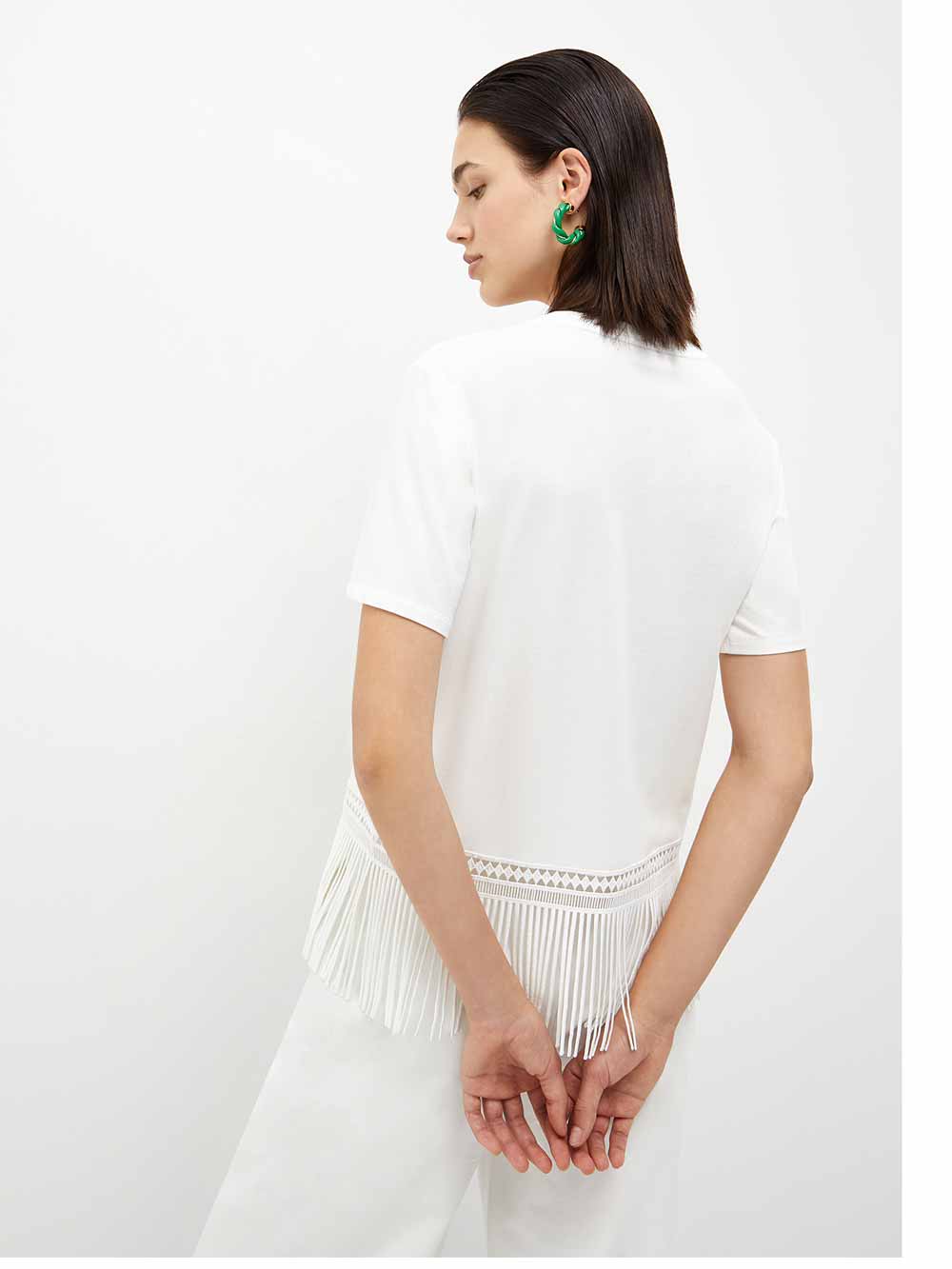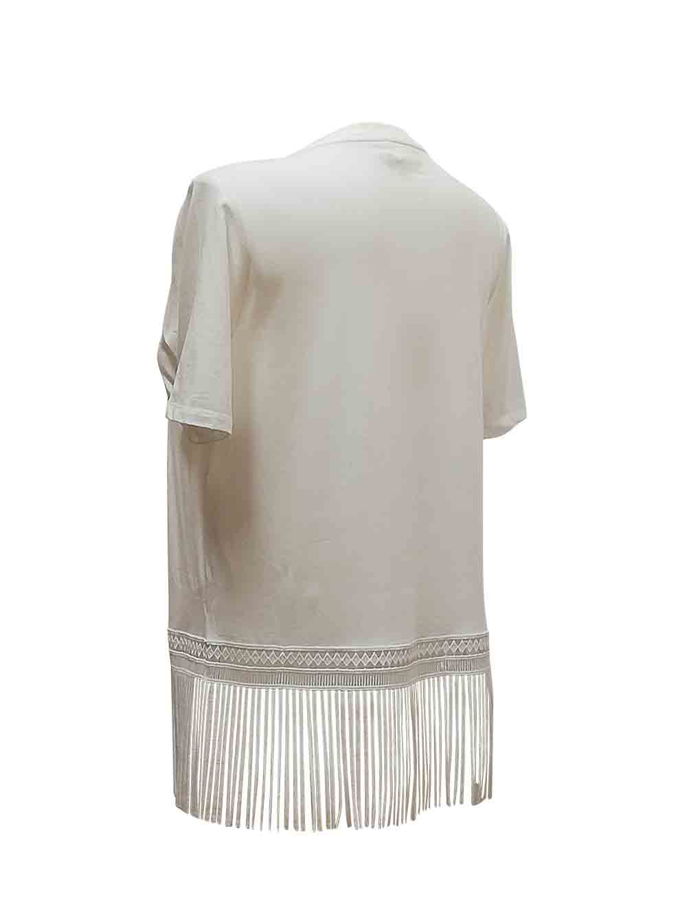 Maglietta color bianco panna donna in morbido e cascante cotone leggermente elasticizzato, scollo rotondo, mezza manica, linea morbida dritta semi corta, sulla parte finale ricca applicazione di bella e grande qualità di balza in pizzo macramé più frange in lavorazione geometrica che dà una lunghezza regolare alla maglietta, sul davanti laterale micrologo in strass luminosi sui toni dell’argento.