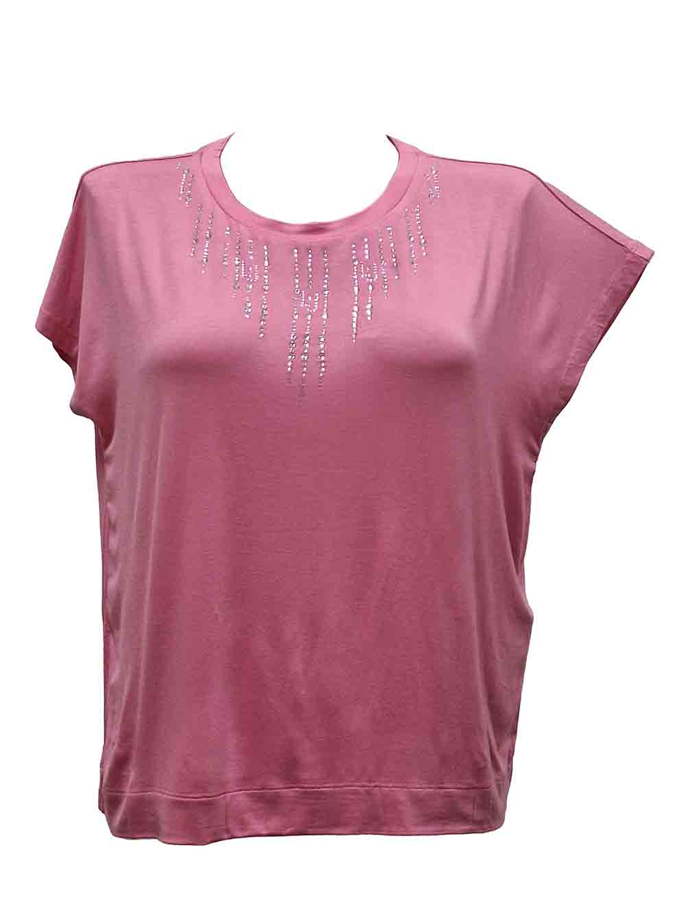 Maglietta rosa Barbie donna in jersey leggero di viscosa, molto cascante e scivoloso, scollo rotondo, manica calata, forma dritta e morbida, non fasciante. Sul davanti ricca applicazione di strass/punti luce molto luminosi in più misure effetto a cascata più loghi.