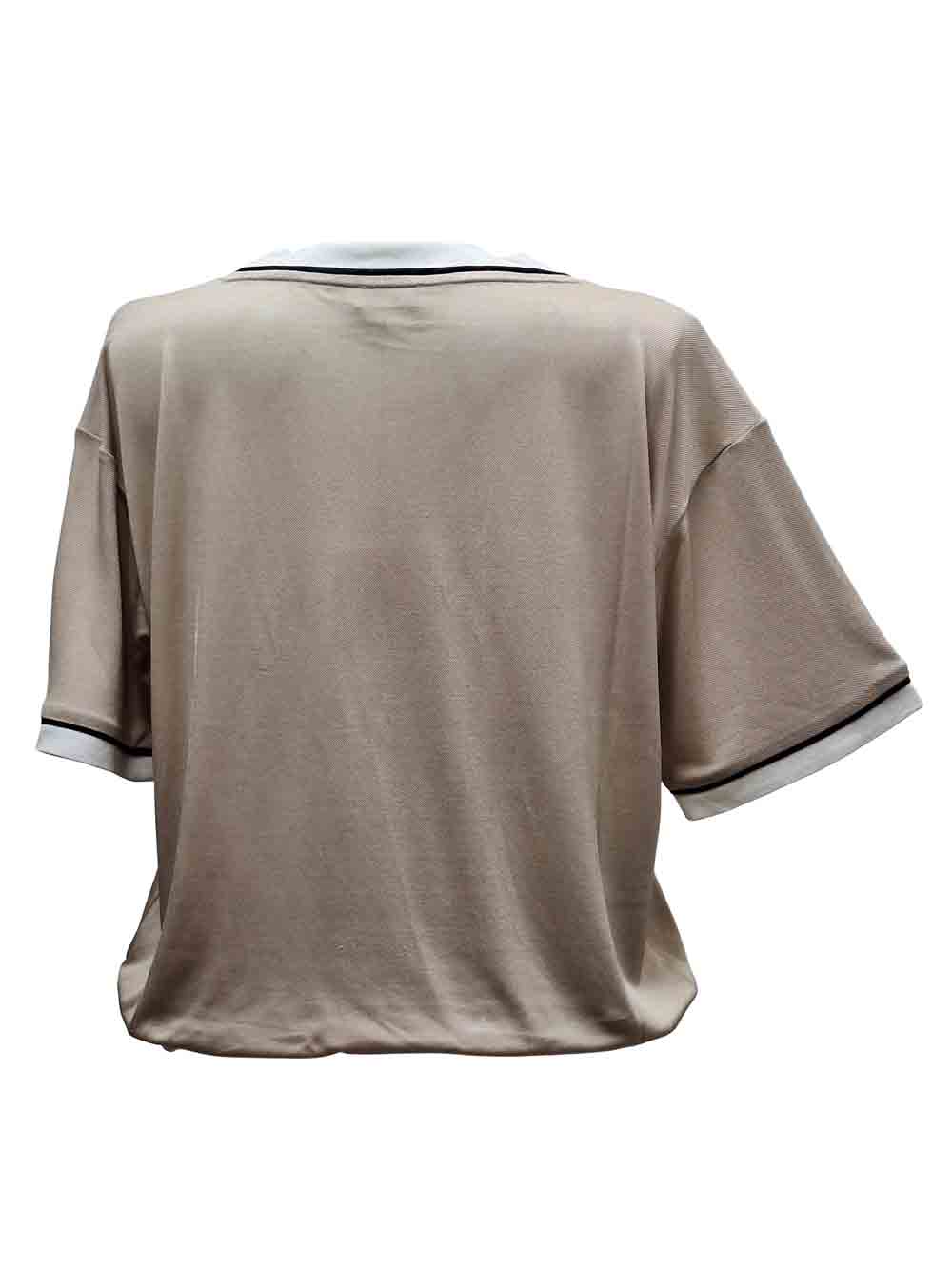 Maglia donna color beige, scollo a V regolare, in viscosa fresca e cascante tessuto lavorazione piquet, mezza manica con girocalato stile anni ’80, modello morbido e blusante, con bordo più coulisse regolabile sul fondo. Il bordo dello scollo e del fondo maniche sono rifiniti in doppio colore panna/nero.