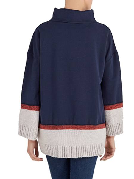 Maxi maglia in cotone felpato, linea over, collo ad anello, tasche sul davanti, finiture fondo e manica in lana bicoloR. 95%cotone, 5% elastan.