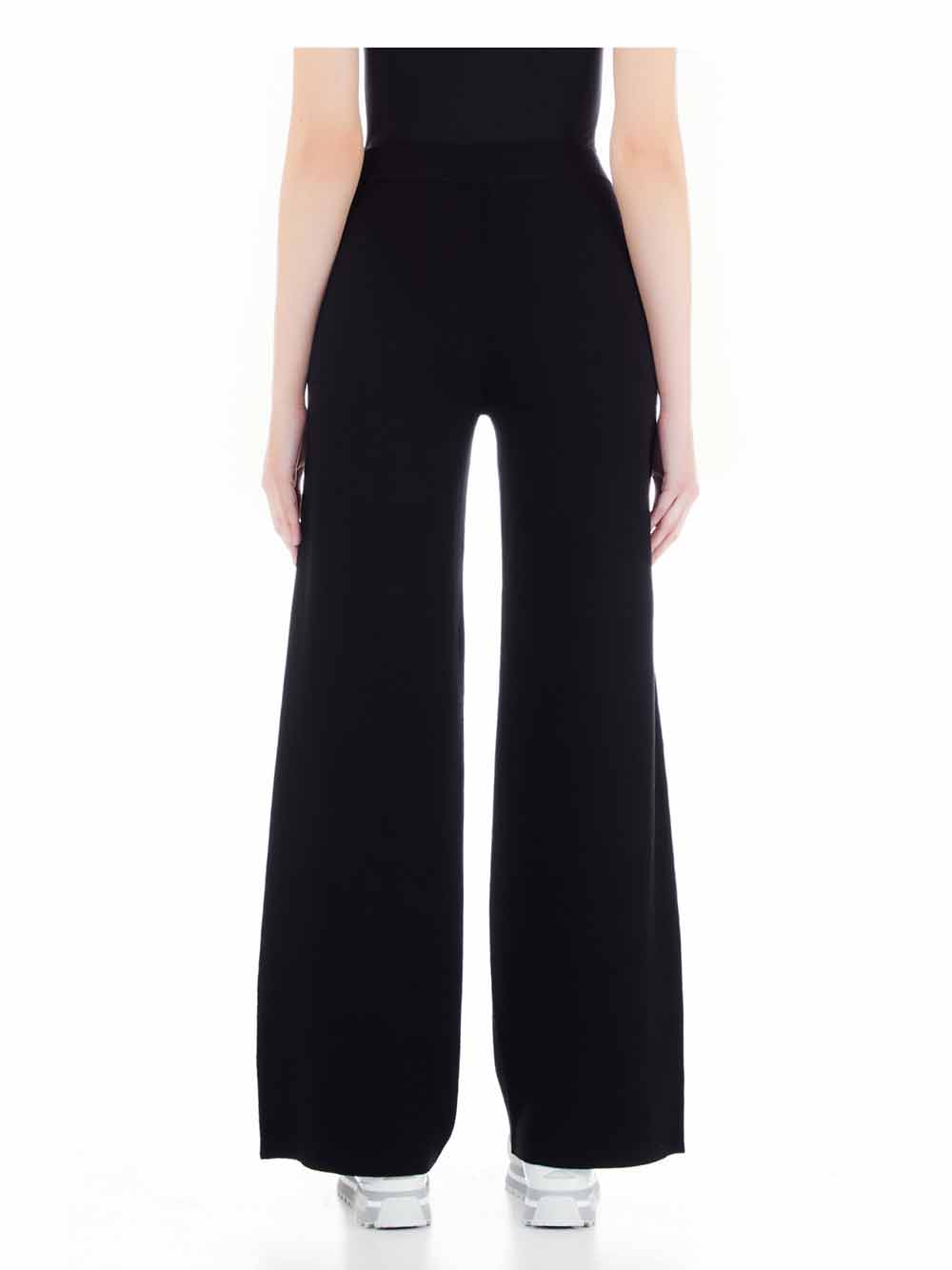 Pantalone largo sport donna nero con banda laterale logata in avorio/lurex doré, in jersey rasato di viscosa pesante effetto maglia stoffa, cinturino morbido con elastico interno invisibile, laccetto regolabile vita, morbido sul gambale, leggermente più largo sul fondo.