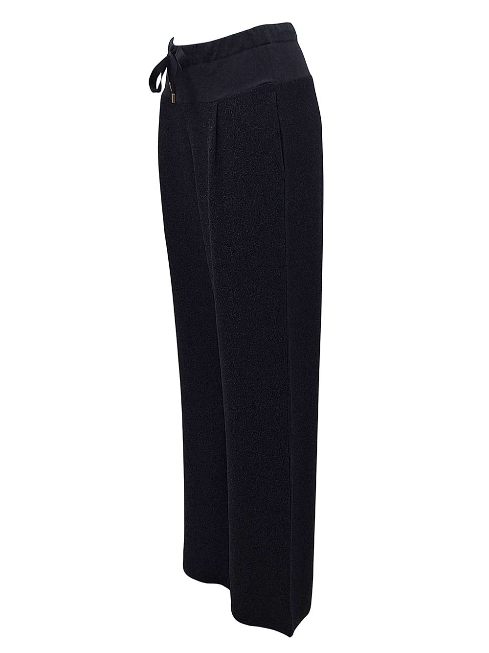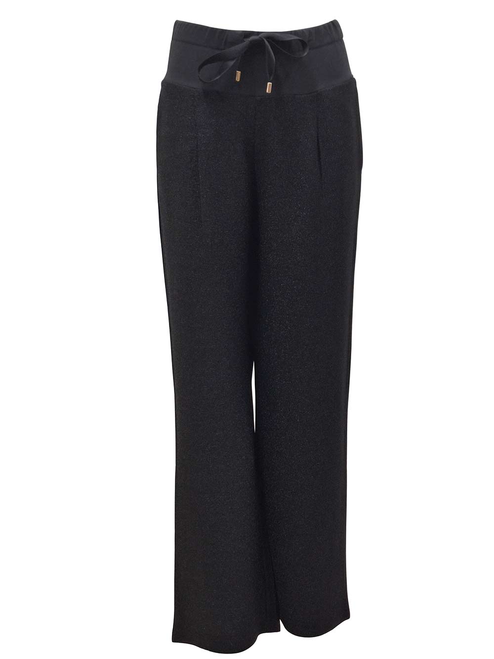 Pantalone sport donna in jersey di viscosa effetto crespo molto scivoloso e cascante in color nero/lurex nero, cinturino/fascia alta in vita in jersey con elastico interno finale più coulisse regoalbile, micro pinces laterali sul davanti per donare morbidezza, gambale largo dritto sul fondo, vestibilità morbida.