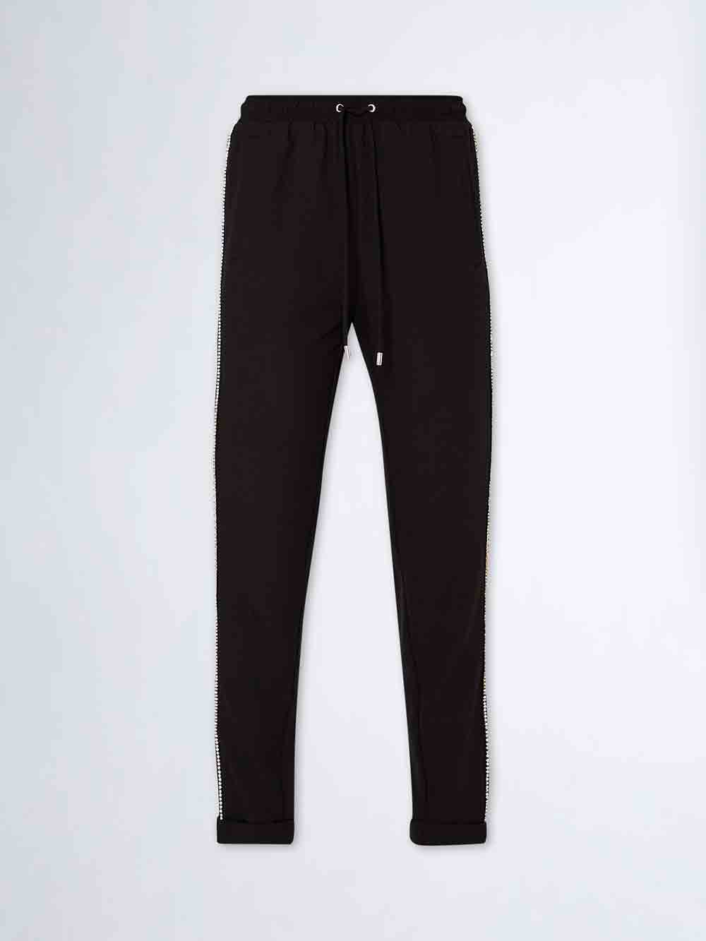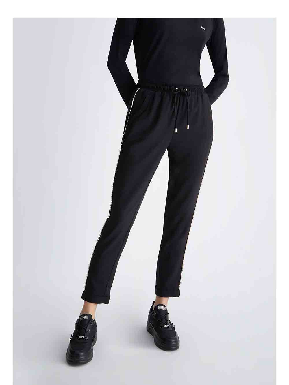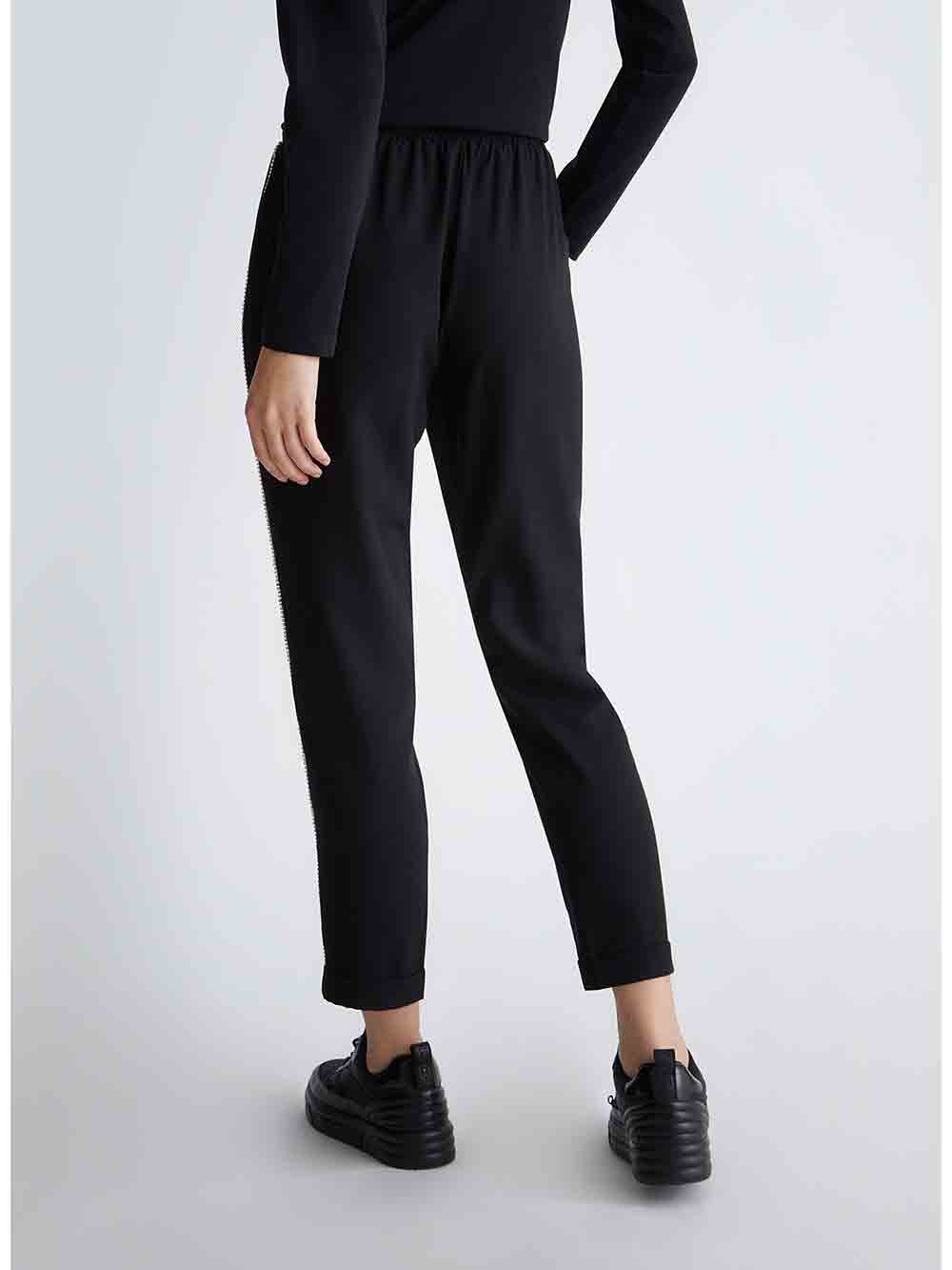 Pantalone nero donna in tessuto tecnico scivoloso e cascante stile crepe leggermente elasticizzato, cinturino vita morbido con elastico interno e coulisse regolabile, tasche laterali con pattina, forma morbida sui fianchi, a stringere sul fondo con risvoltino, sui fianchi ricco profilo stile gioiello con perline bianche e strass luminosi per un tocco elegante.