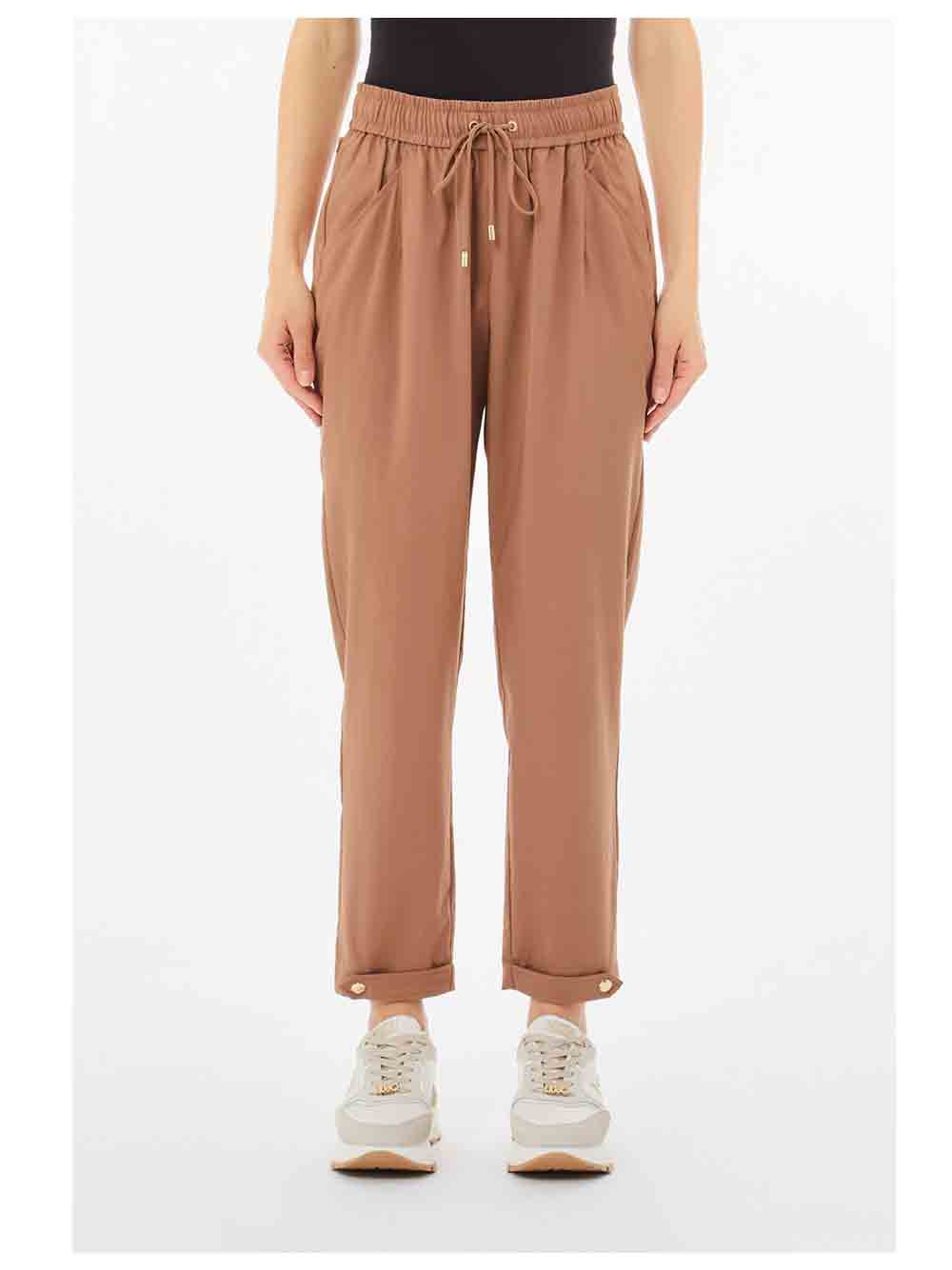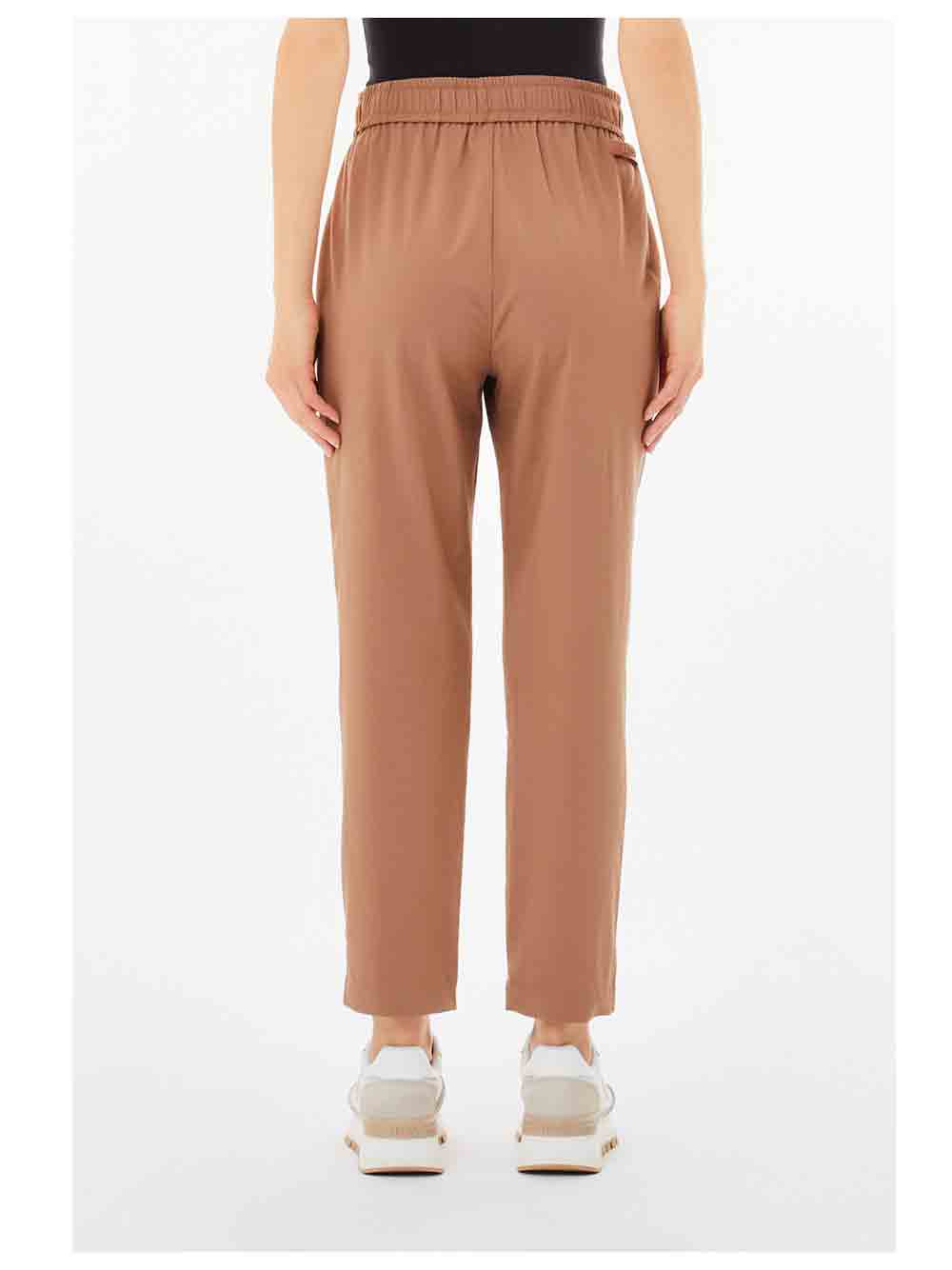 Pantalone sport donna color caramello/nude scuro in tessuto di bambù naturale, cinturino vita morbido tutto arricciato con elastico interno più laccetto regolabile, tasche sul davanti trasversali, gambale morbido che va a stringere sul fondo rifinito con laccetto e bottone gioiello.