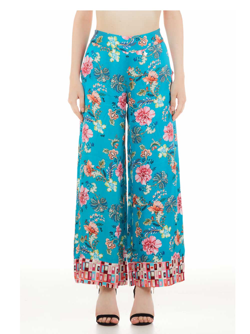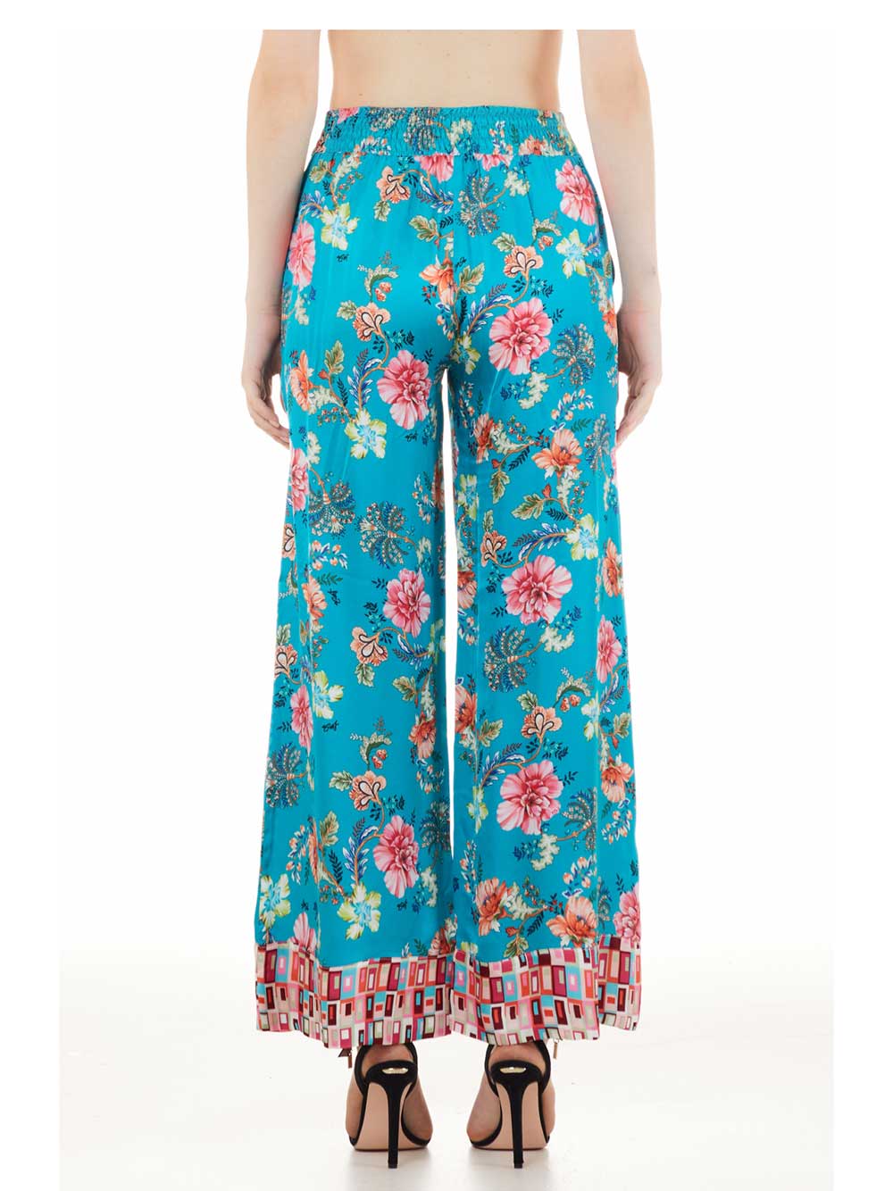 Pantalone donna stampa floreale/optical esclusiva logata sui toni dell’ottanio/rosa/verde/arancio/caramello/panna/azzurro in tessuto simil raso opaco fresco e cascante, forma a palazzo, cinturino alto liscio sul davanti, tutto arricciato dietro molto comodo no stringe, tasche laterali a vista, forma gambale grande dritto sul fondo, sul finale balza in fantasia optical a contrasto sui toni del rosa.