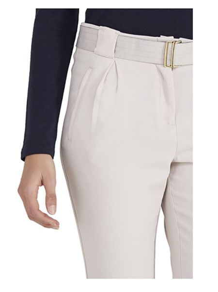 Pantalone color corda in tessuto tecnico crêpe elasticizzato, doppie pinces e tasche profilate sul davanti. Punto vita comodo rifinito con passanti alti più cintura in gros-grain. 97% poliestere, 3% elastan.