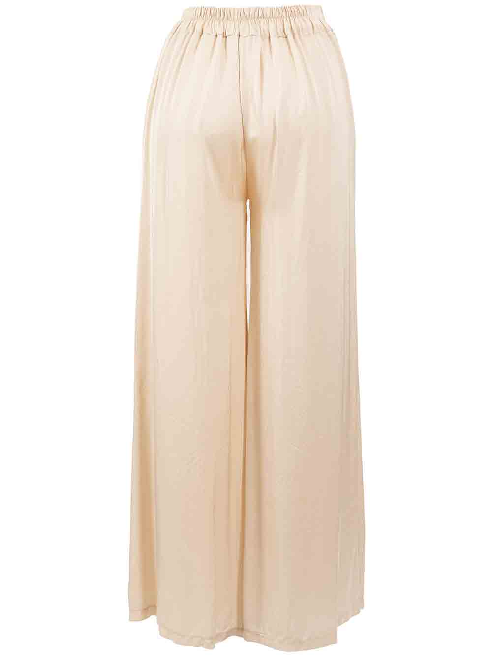 Pantapalazzo donna beige in viscosa cascante, cinturino in vita liscio sul davanti, arricciato sul dietro con elastico interno, tasche laterali a filo, largo sul fondo, no trasparente.