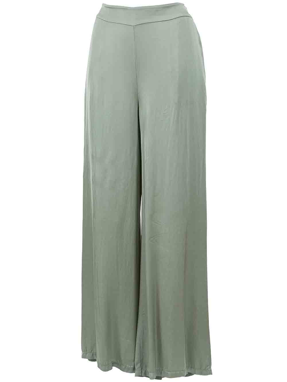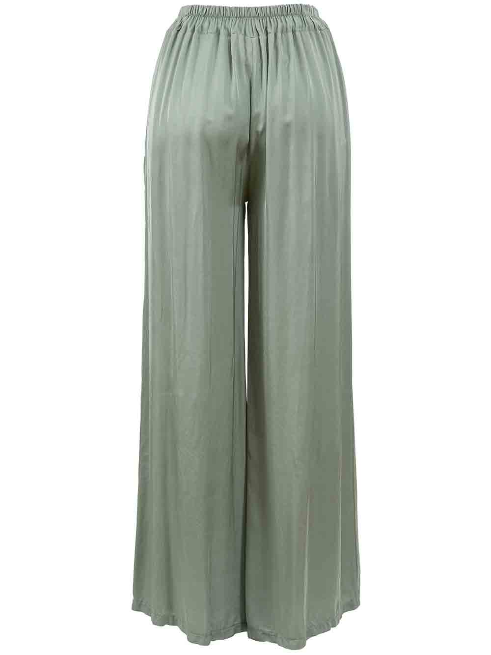 Pantapalazzo donna verde salvia in viscosa cascante, cinturino in vita liscio sul davanti, arricciato sul dietro con elastico interno, tasche laterali a filo, largo sul fondo, no trasparente.