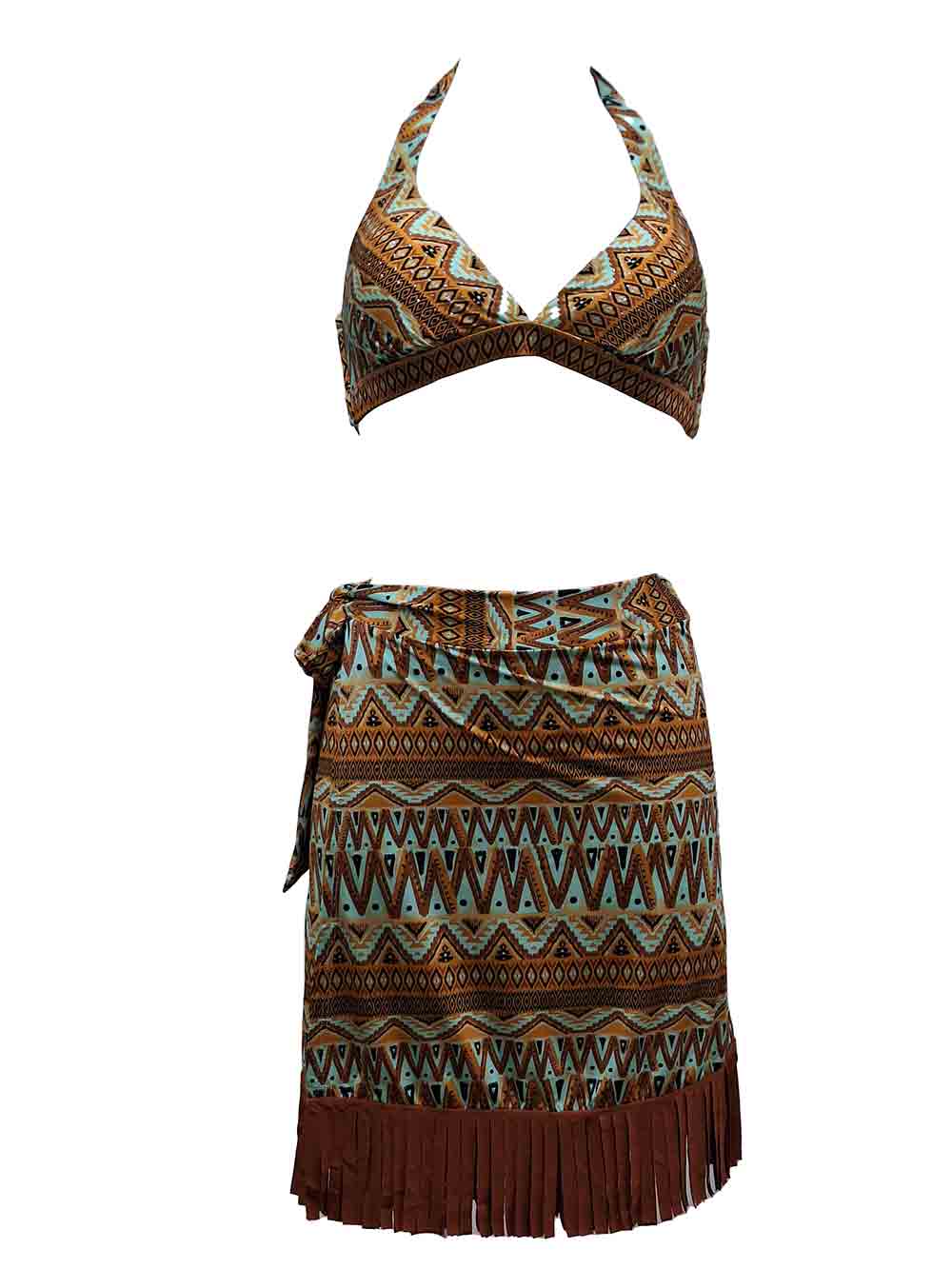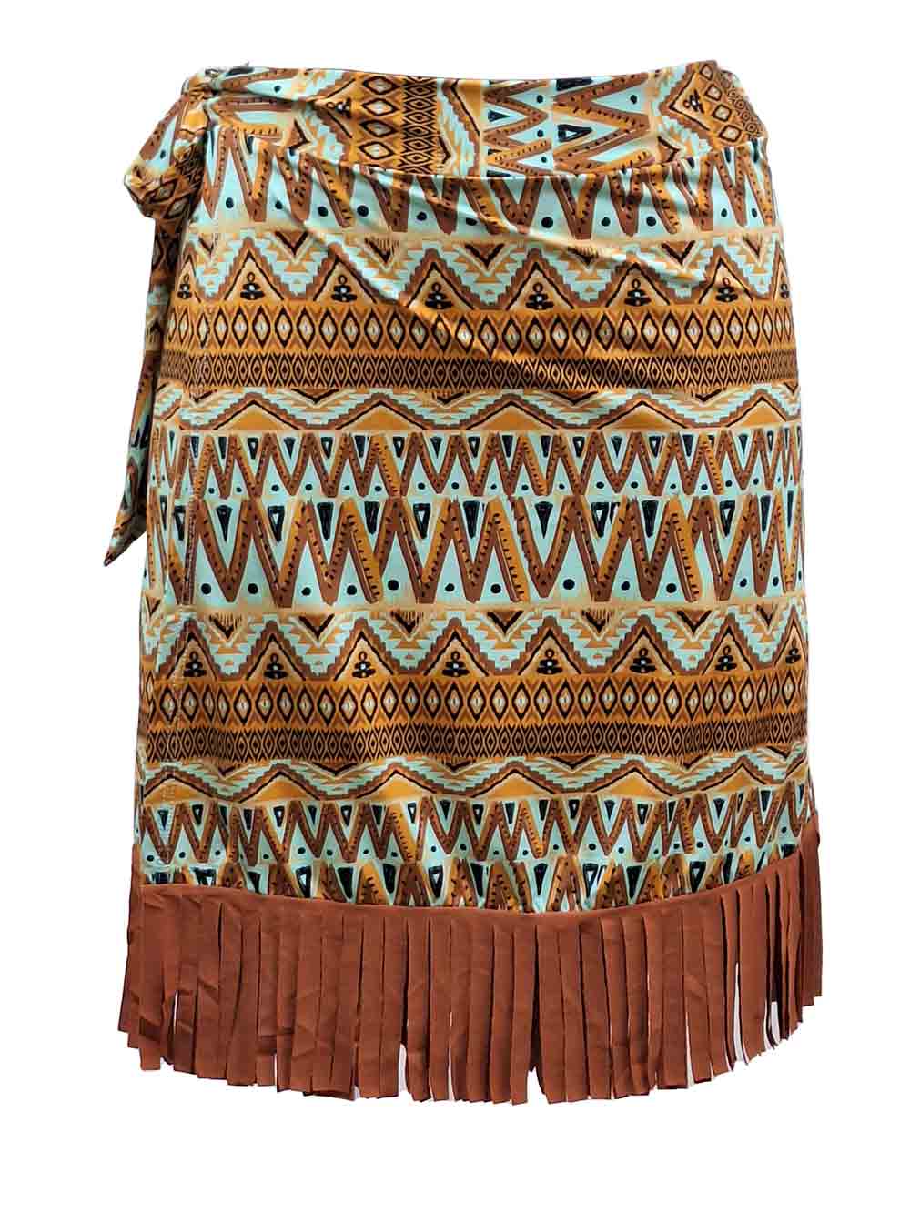 Pareo/gonna donna in morbidissima e scivolosa lycra opaca, stampa stile Indios sui toni dell’acquamarina/tabacco/beige/caramello/nero, forma a portafoglio sovrapposta a incrocio, ottima copertura, laccio morbido per incrociare e fare fiocco punto vita, lunghezza sopra il ginocchio, sul finale balza frange sui toni del mattone rosato.