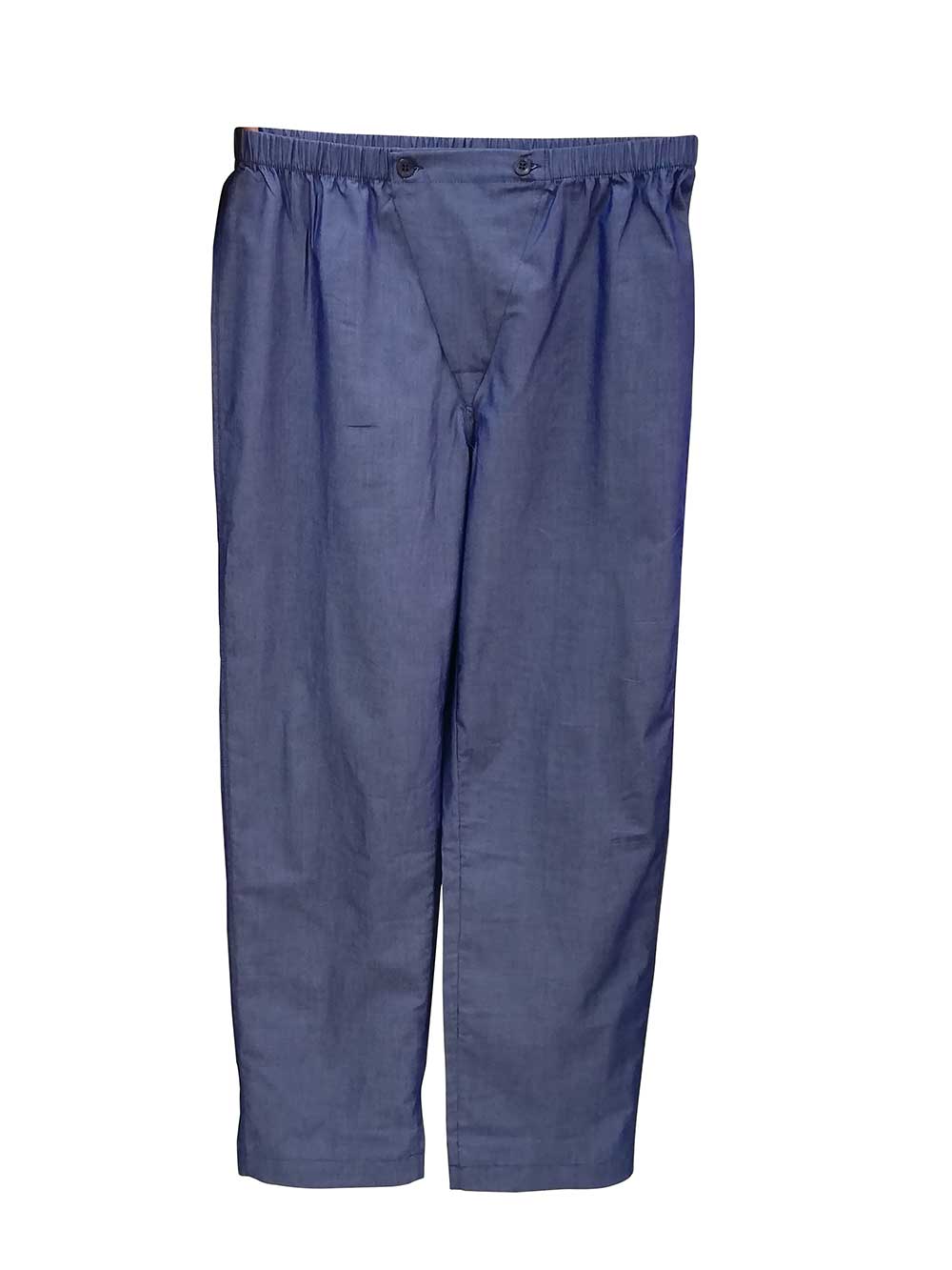 Pigiama classico uomo in tela di cotone lavorazione effetto Oxford composto da: giacca aperta con bottoni, fondo denim melange fantasia righe sui toni del cipolla/caramello/celeste/bianco, collo stile camicia, due tasche sul davanti; pantalone denim melange unito taglio classico, punto vita con elastico interno arricciato aperto sul davanti con bottoni a incrocio, dritto sul fondo.