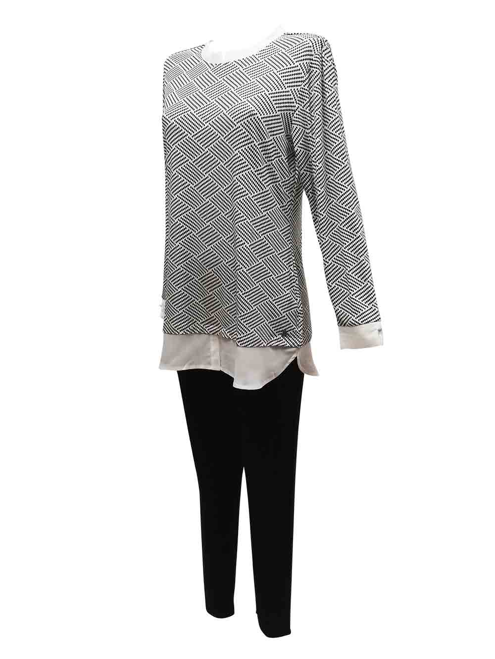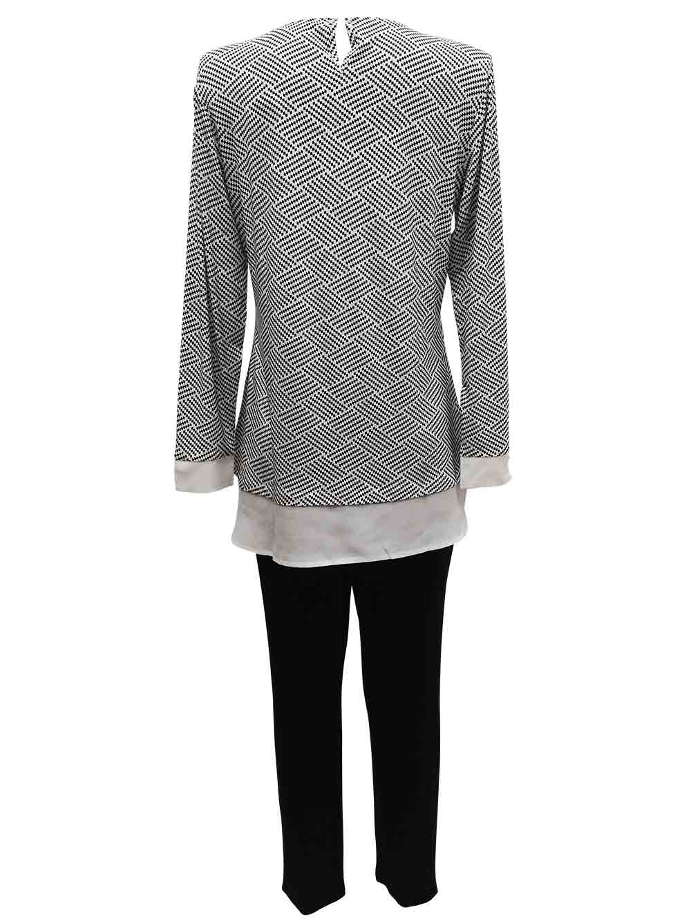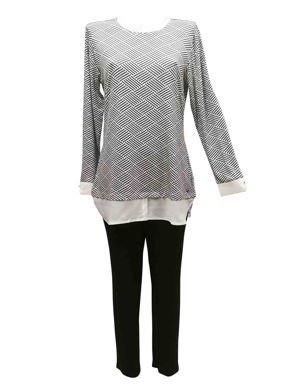 Pigiama donna bicolor bianco/nero in morbido, cascante e corposo modal, composto da: casacca stile camicia fantasia optical nera su fondo bianco, forma a girocollo più finto colletto bianco, aperta sul dietro con bottoncino, manica con polsino finale in tessuto con bottoncino stile camicia, forma leggermente svasata, semi lunga con fianco coperto, piccola balza finale effetto doppio sempre in tessuto binaco; pantalone taglio basic, cinturino alto vita con elastico interno morbido, tasche laterali, morbido sul gambale che va a stringere sul fondo.