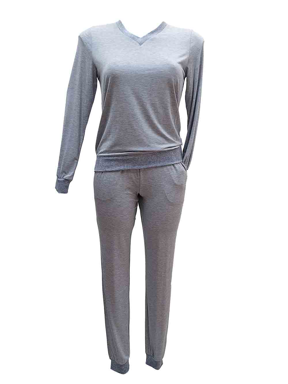 Pigiama donna color denim chiaro melange unito in morbida e cascante fibra di viscosa naturale, piccolo scollo V sul davanti profilato con morbida ciniglia rasata tono su tono come il polsino finale della manica e la fascia finale della maglia, che dona una linea blusante. Pantalone taglio tuta, punto vita con cinturino molto morbido, con elastico interno invisibile, tasche laterali oblique, forma a stringere sul fondo con polsino in ciniglia, come il cinturino in vita.