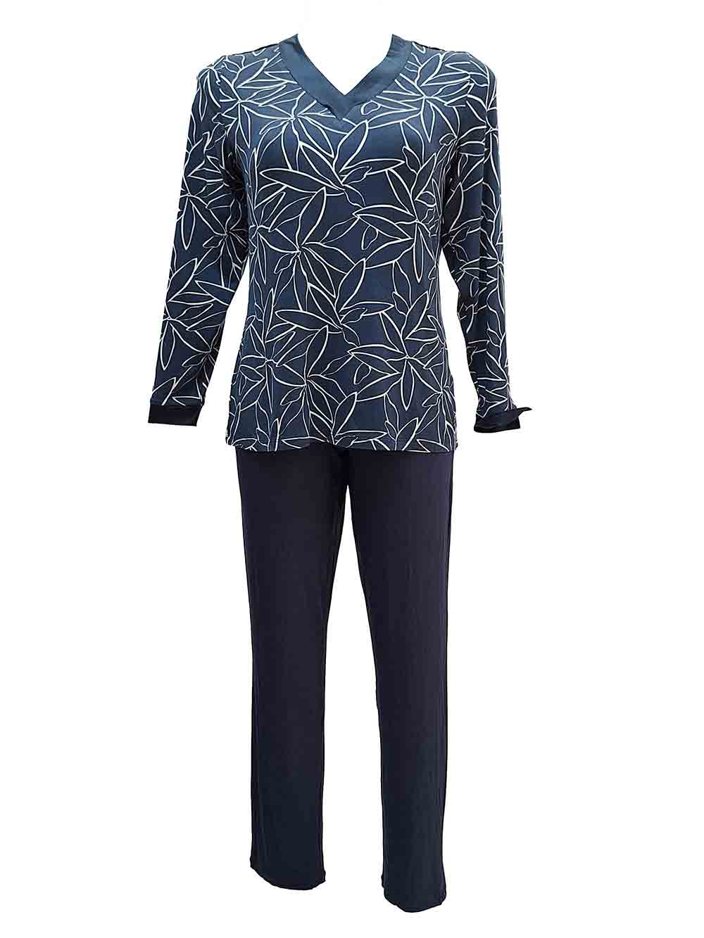 Pigiama donna blu plumbeo in morbida e cascante fibra di viscosa naturale composto da: maglia fantasia macro foglie sui toni del bianco, scollo V sul davanti con profilo in raso elastico doppiato blu unito, come il polsino finale della manica stile camicia, linea leggermente a svasare sul fondo. Pantalone blu plumbeo unito, elastico medio invisibile punto vita, cinturino leggermente arricciato, tasca laterale obliqua, gambale morbido che va a stringere sul fondo.