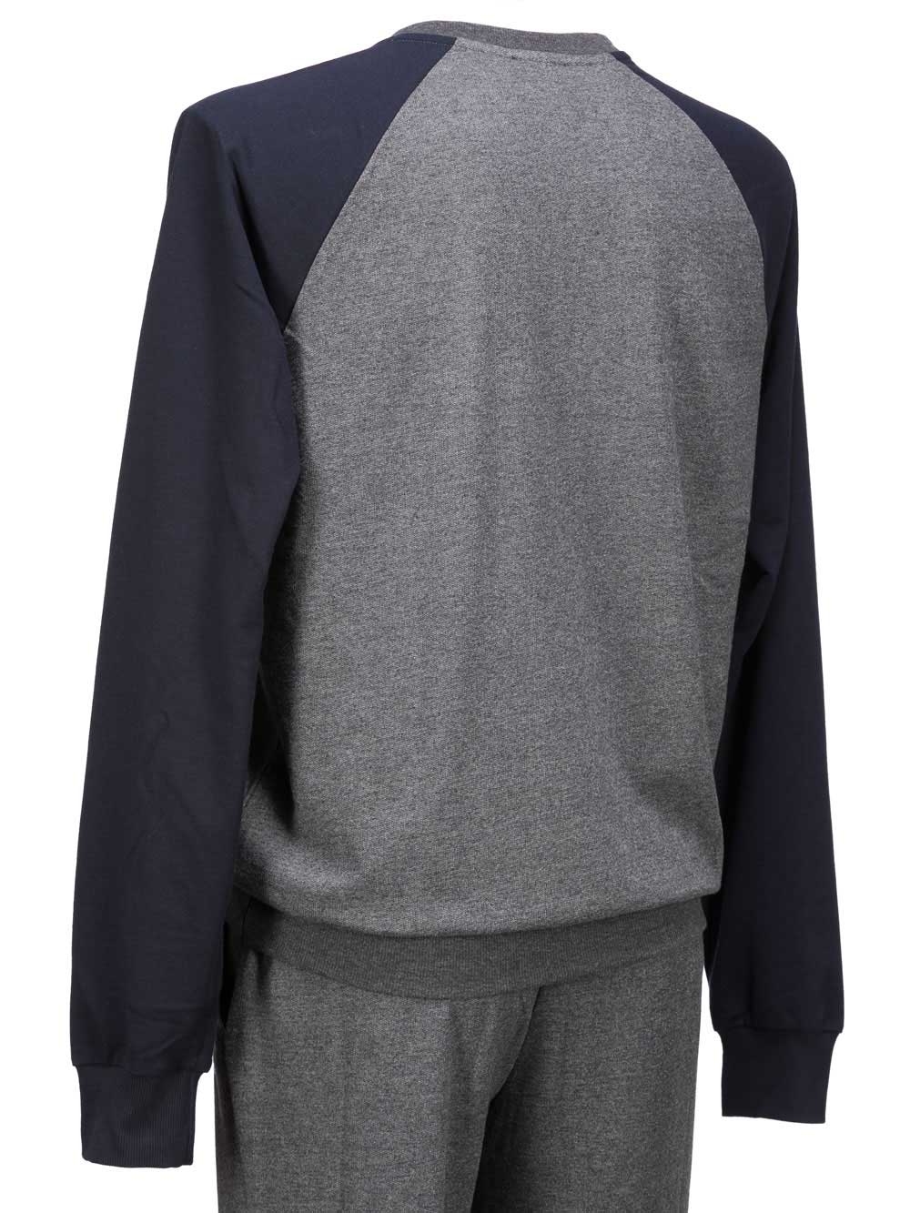 Tuta homewear/pigiama uomo sui toni del grigio melange/blu in misto cotone composta da: maglia girocollo con maniche raglan, parte davanti e dietro grigio melange, logo blu sul davanti, maniche blu; pantalone tuta con laccetto regolabile in vita, tache laterali, polsino morbido sul fondo, vestibilità confort.