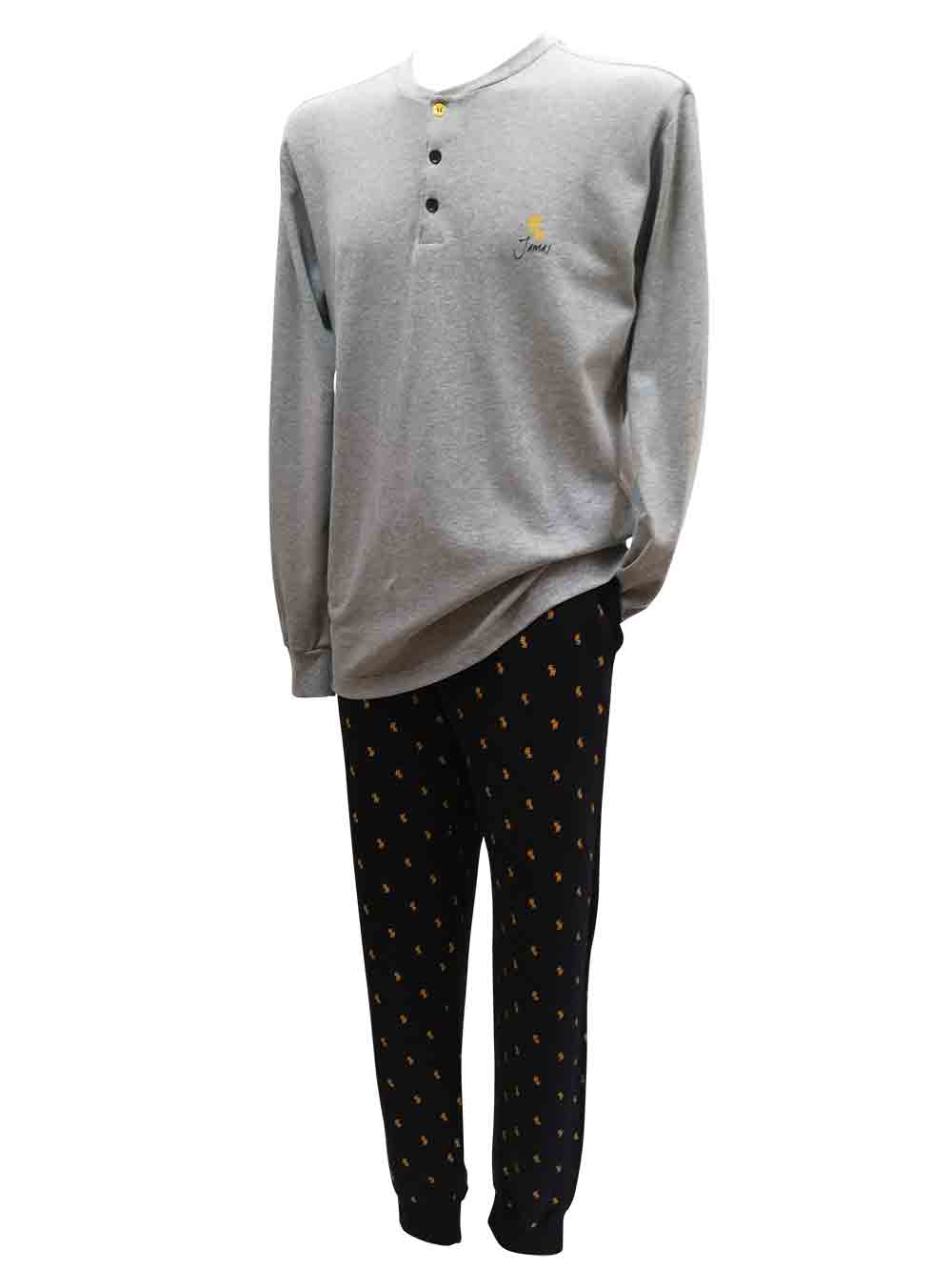 Pigiama uomo bicolorin morbido cotone doppiato con mano calda e pesante composto da: maglia color grigio chiaro melange girocollo/serafino con bottoni gialli/blu, dritto sul fondo con vestibilità comoda, maniche a stringere con polsino finale; pantalone stampa all-over grafica cagnolino taglio tuta con cinturino alto morbido con elastico interno e laccetto regolabile, tasche laterali, va a stringere sul fondo con polsino comodo.