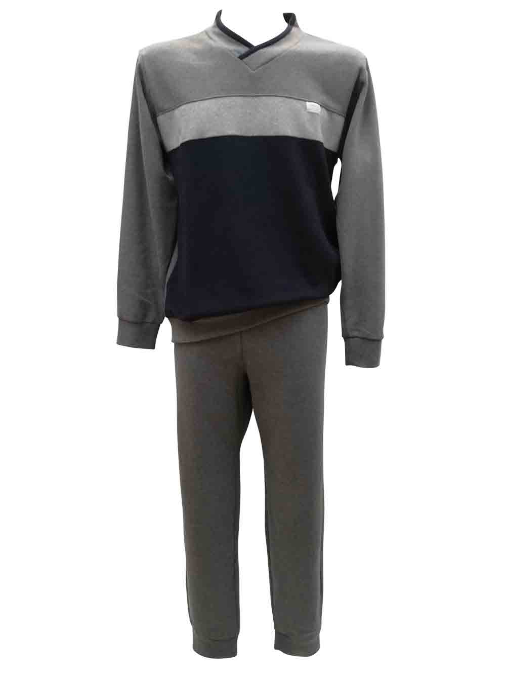 Pigiama/tuta casa uomo grigio medio in morbido e caldo cotone felpato, spazzolato all’interno composto da: maglia stile pullover con piccolo scollo V incrociato. Parte spalla, maniche e dietro sono tutte di colore grigio medio melange, fascia centrale color grigio perla, parte bassa in blu. Pantalone tutto grigio medio felpato, taglio tuta con elastico arricciato in vita, tasca sul retro, stretto sul fondo con polsino finale.