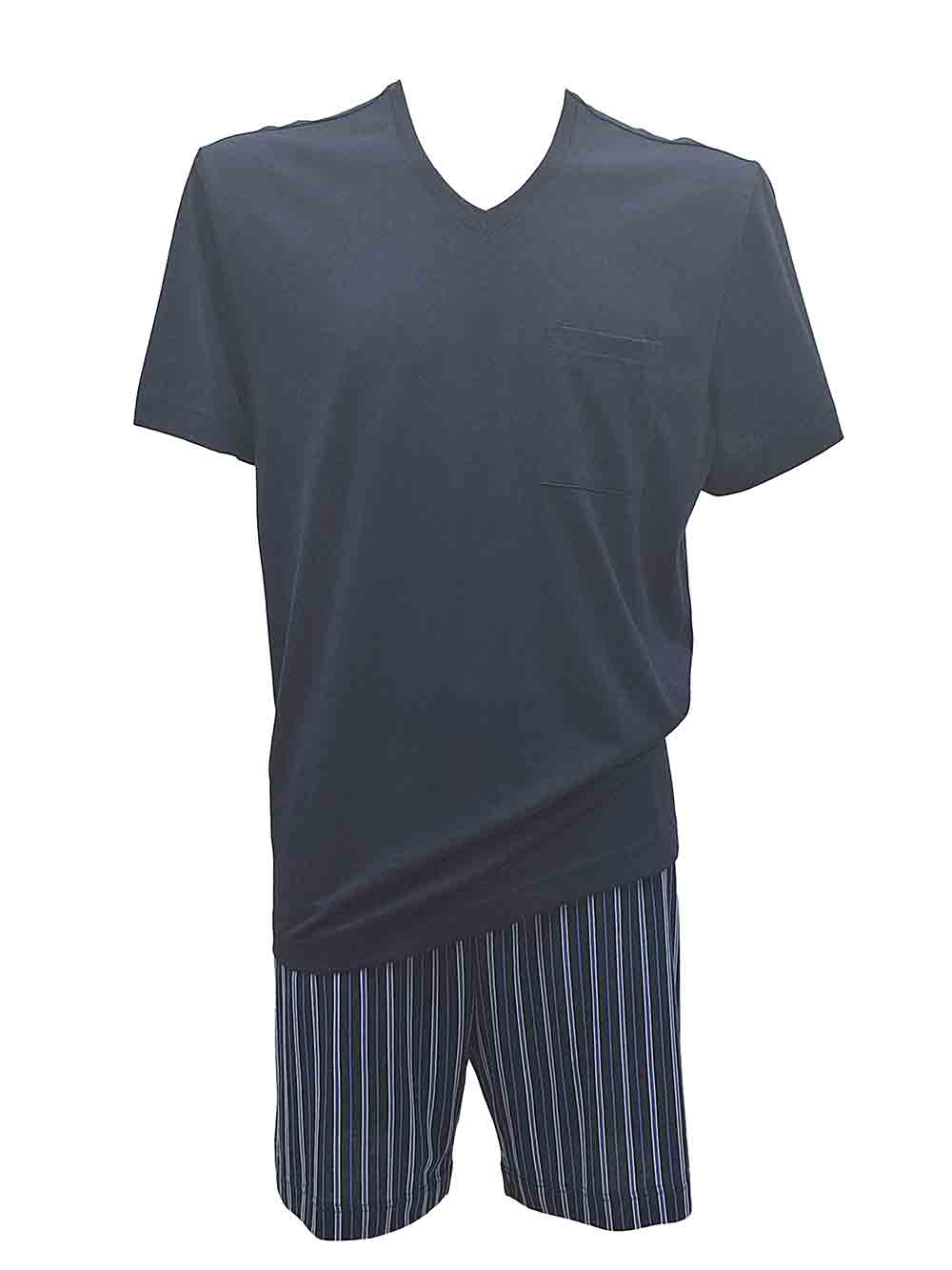 Pigiama uomo in morbidissimo jersey di cotone semi-bloccato mano scivolosa semilucida composto da: maglia blu, scollo V piccolo, mezza manica, taschino laterale; pantalone bermuda semi-corto fondo blu fantasia righe sui toni dell’azzurro/bianco, cinturino morbido in vita.