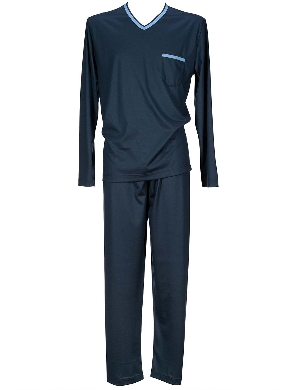 Pigiama uomo in morbidissimo jersey di cotone semi-bloccato mano scivolosa semilucida composto da: maglia blu scollo V manica lunga, profilo azzurro sullo scollo e sul taschino laterale, vestibilità comoda; pantalone blu con elastico vita morbido, che va a stringere sul fondo. Collezione Autunno Inverno 2020.