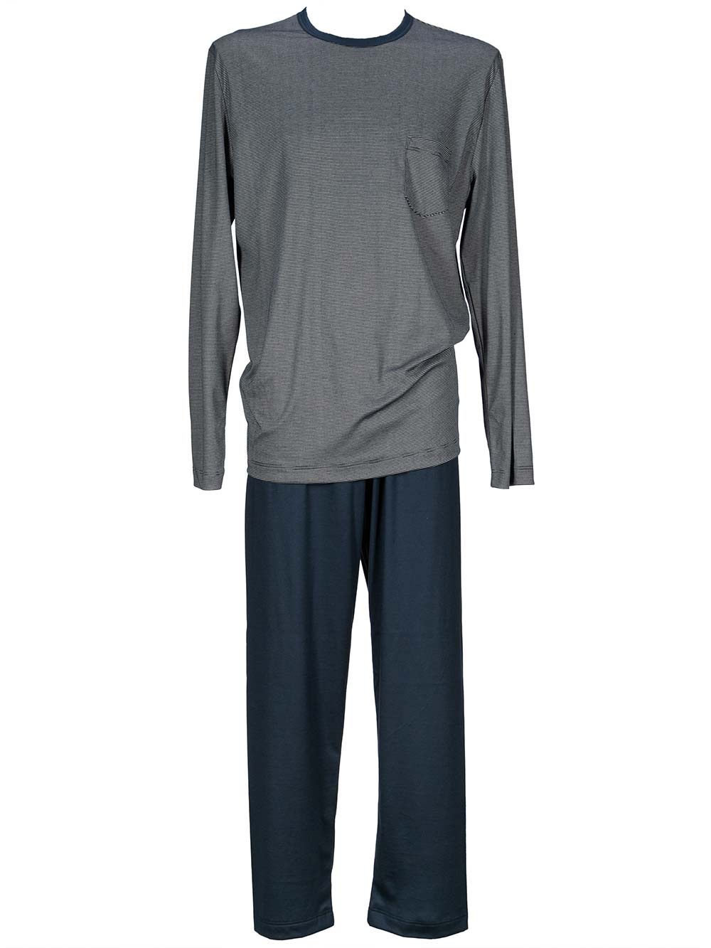 Pigiama uomo in morbidissimo jersey di cotone semi-bloccato mano scivolosa semilucida composto da: maglia girocollo manica lunga, lavorazione rasata effetto microriga sui toni del bianco/blu, effetto cangiante profilo blu nel girocollo, taschino laterale; pantalone blu unito, elastico morbido vita, va leggermente a stringere sul fondo. Collezione Autunno Inverno 2020.