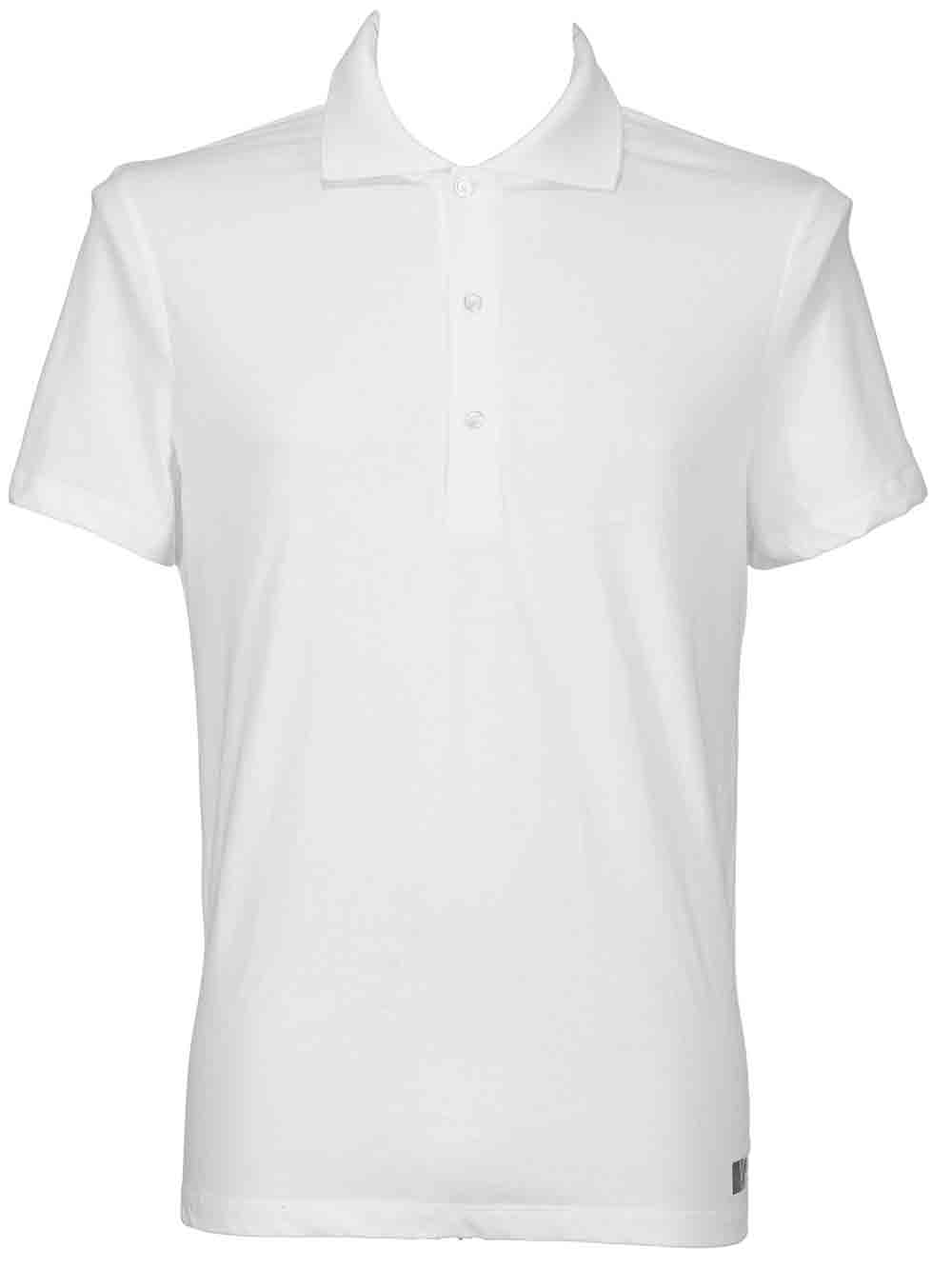 Polo bianca uomo in puro cotone, mezza manica, sul retro mezza banda centrale nera logata in bianco, no stiro, vestibilità morbida.