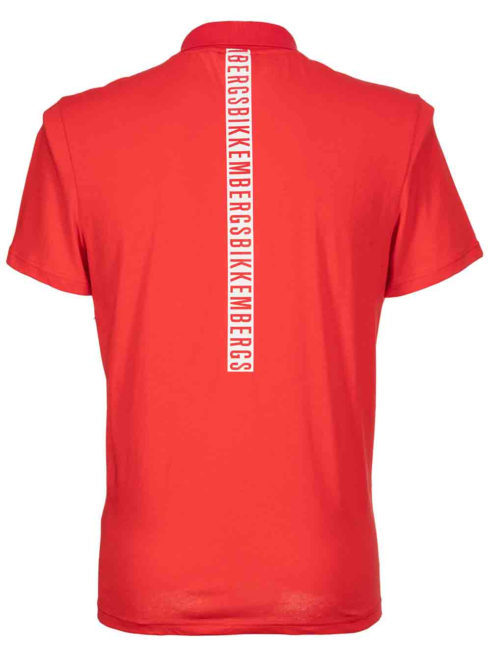 Polo rossa uomo in puro cotone, mezza manica, sul retro mezza banda centrale bianca logata in rosso, no stiro, vestibilità morbida.