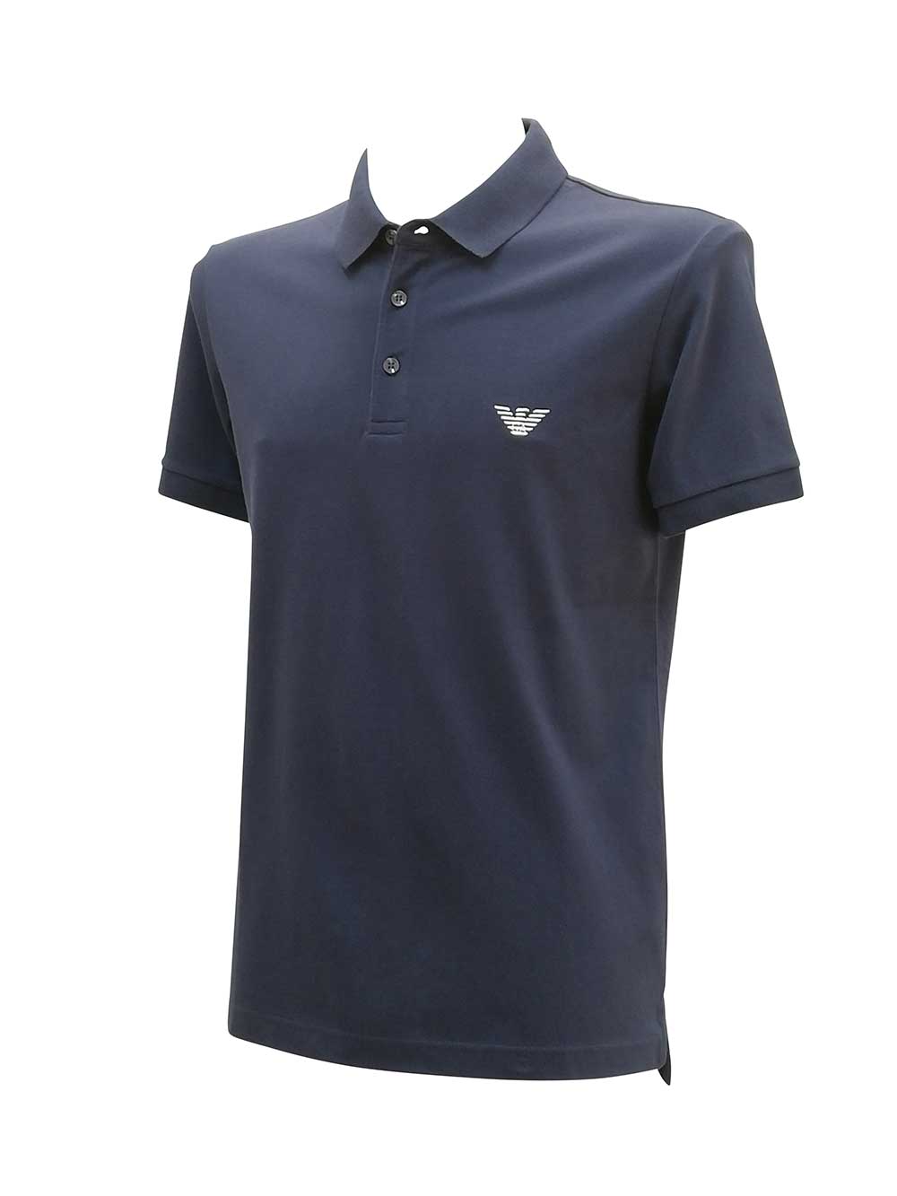 Polo blu uomo, mezza manica, in cotone elasticizzato con lavorazione a piquet, quindi mano più corposa, sul fondo spacchetti laterali, leggermente più lunga sul dietro, sul davanti laterale logo aquilotto ricamato in filoseta bianco, vestibilità confort.