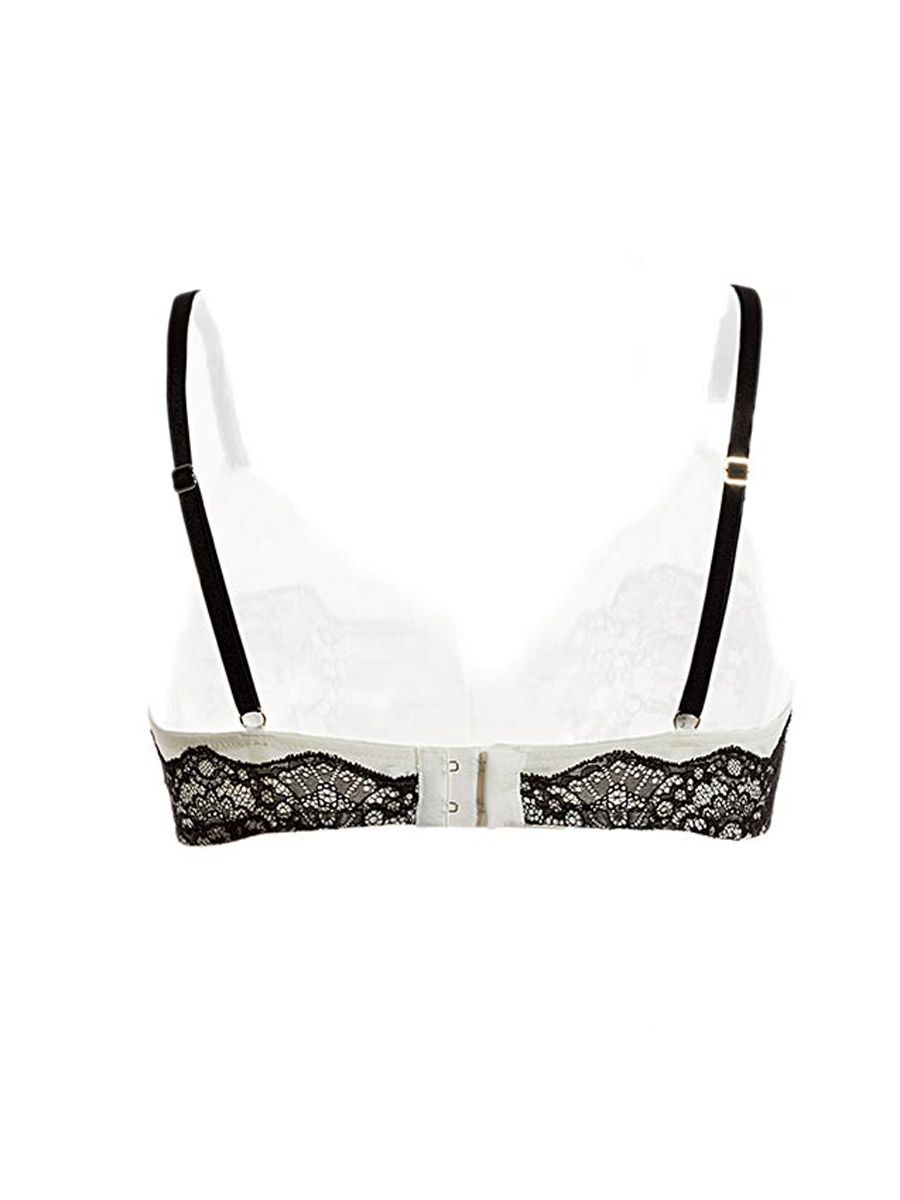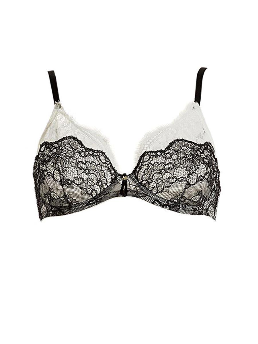 Reggiseno con ferretto, effetto goccia. In pizzo effetto chantilly panna, rifoderato con pizzo nero, effetto bicolor. Spallini regolabili.