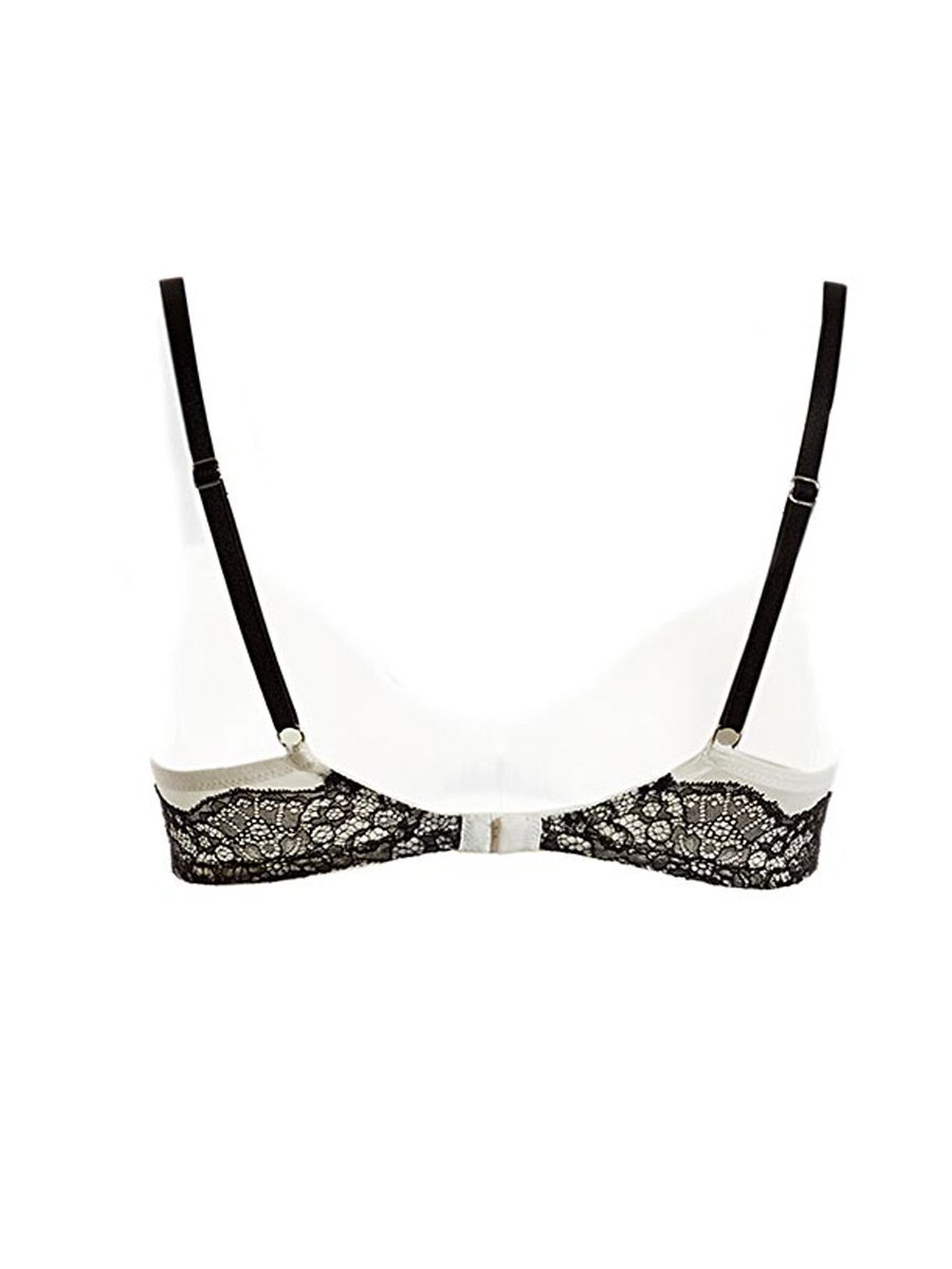 Reggiseno push-up imbottito in pizzo chantilly panna, tutto rifoderato in pizzo nero, effetto bicolor. Spallini regolabili, tascha interna con pesciolino. Microgioello sul davanti.