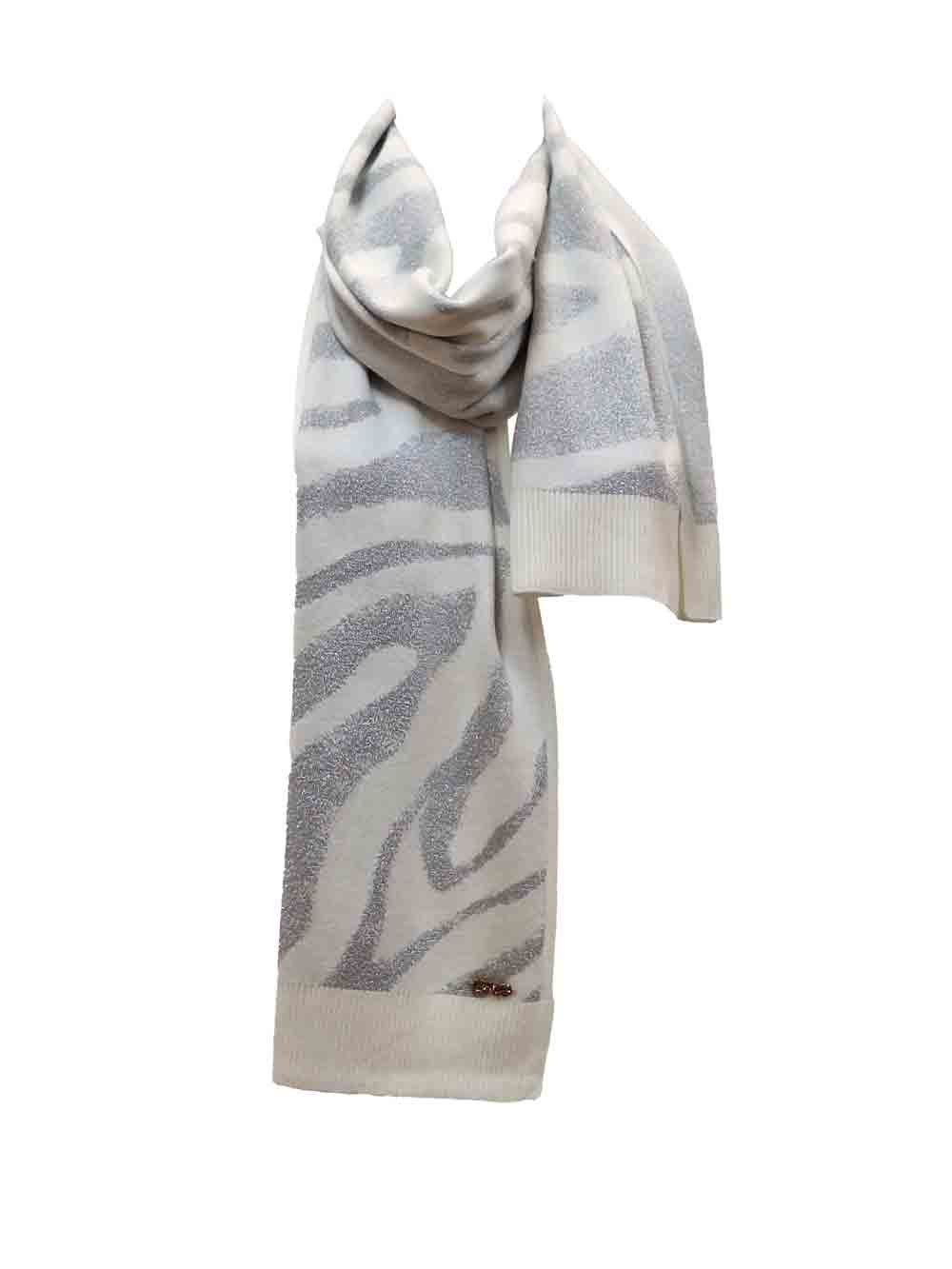 Sciarpa donna fantasia new animalier zebrato sui toni del bianco panna/lurex rame chiaro in corposa maglia rasata. Dimensioni 190cm x 36cm.
