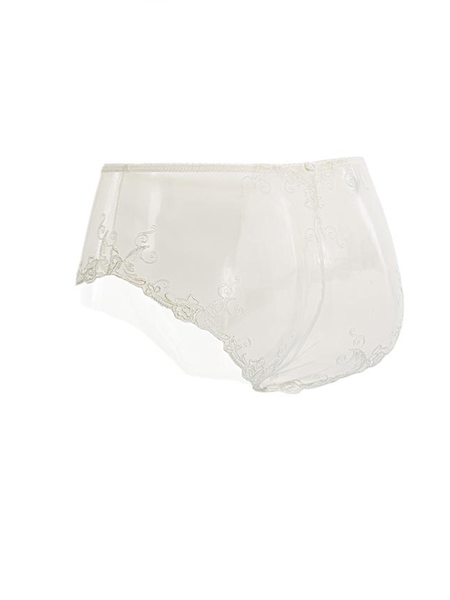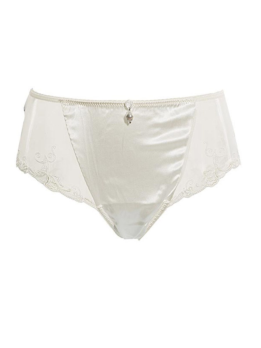 Slip alto, inserto centrale in seta elasticizzata con accessorio perla centrale. Laterale e dietro in toulle con ricamo filo motivo rose. Vestibilità confortevole. Rigorosamente made in Italy.