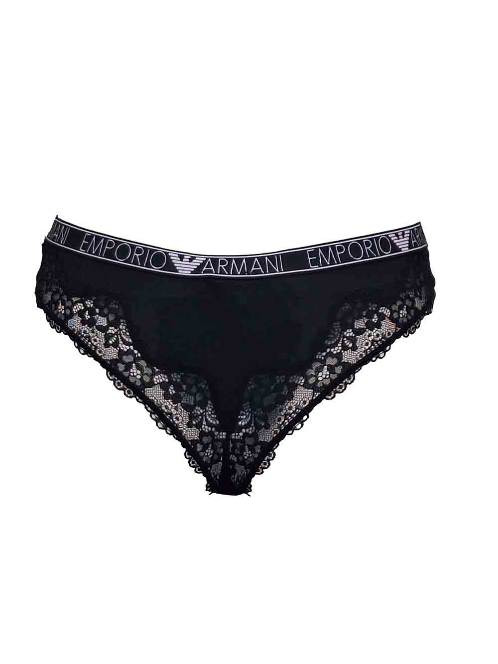 Slip brasiliano nero donna in morbidissima viscosa naturale, liscio sul davanti, sul dietro sulla parte finale applicazione di pizzo elasticizzato motivo floreale/rete, no taglio. Tutto il girovita è rifinito con elastico morbido logato nero/lilla.