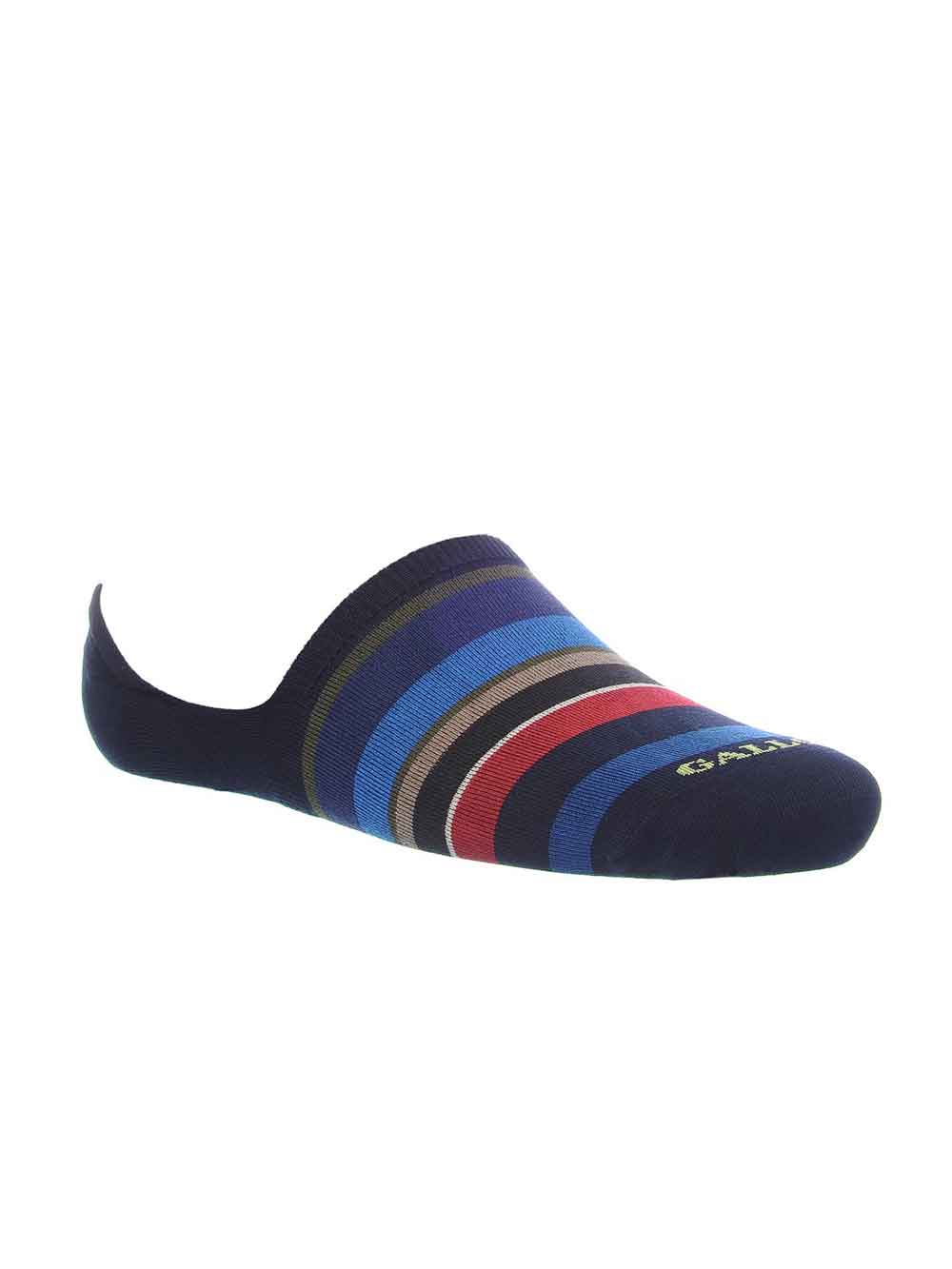 Soletta uomo in cotone filo di scozia superlight elasticizzato, punta rimaglio a mano, massima estensione e superficie sottile. Taglia unica 40-45. Fantasia multirighe sui toni del blu/blu melange/grigio. Collezione primavera estate 2018.