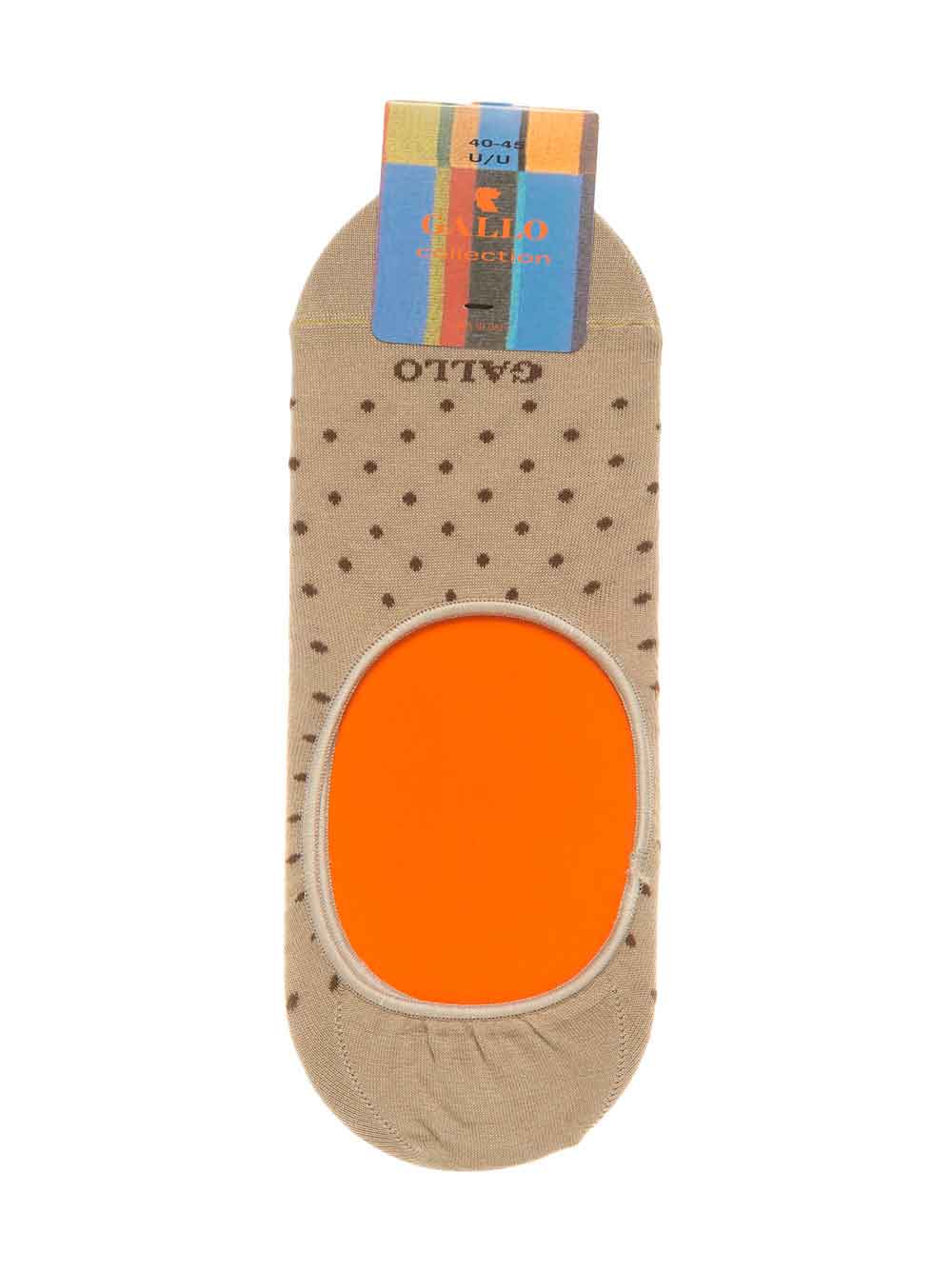 Soletta uomo in cotone filo di scozia superlight elasticizzato, punta rimaglio a mano, massima estensione e superficie sottile. Taglia unica 40-45. Fantasia pois marroni su fondo beige. Collezione primavera estate 2018.