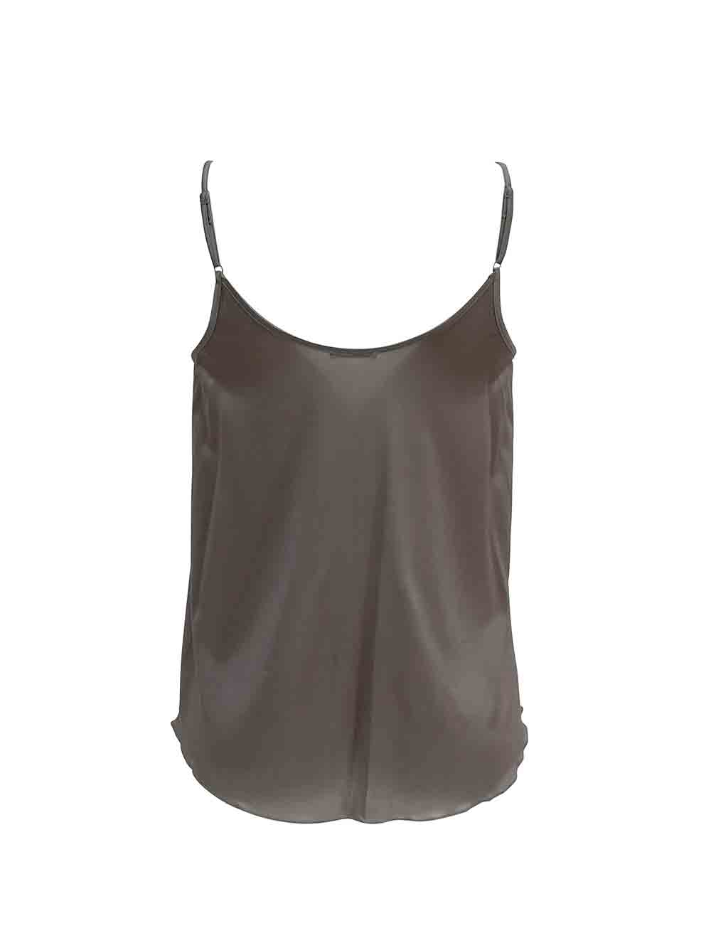 Top donna esternabile color grigio metallo chiaro in cascante e scivolosa fibra naturale viscosa/modal effetto lucido/seta, spallina stretta regolabile stile reggiseno, scollo a V sul davanti, forma morbida a svasare dul fondo con stondatura finale, più corta sui fianchi, vestibilità morbida.
