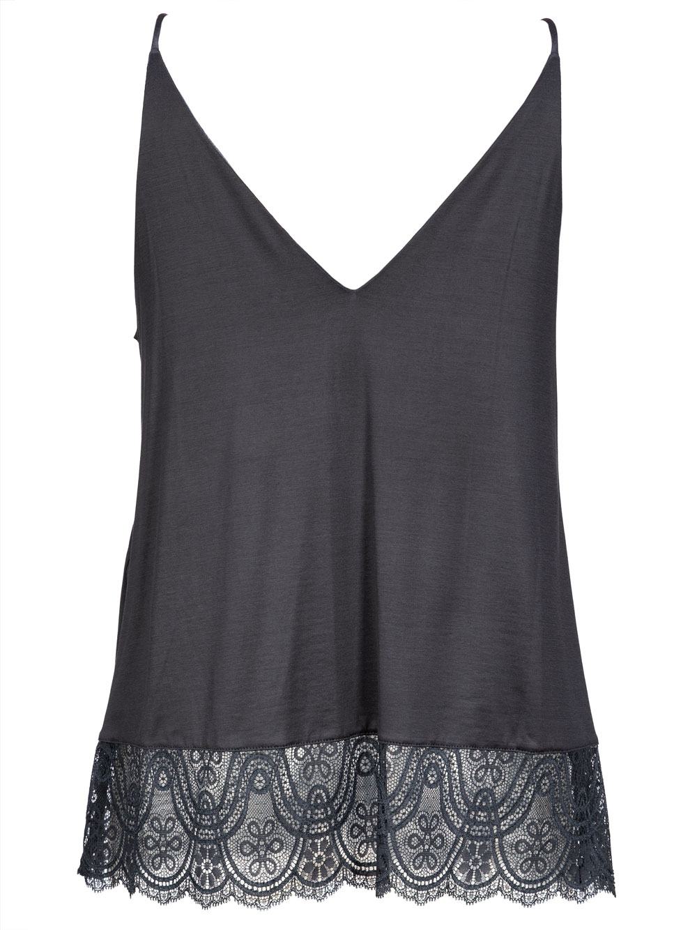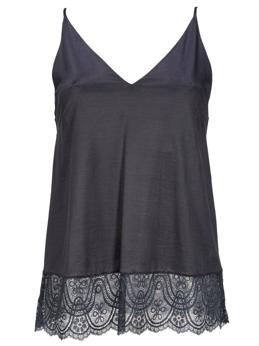 Top donna esternabile blu plumbeo donna in fibre naturali di cotone e viscosa semi-lucido, molto scivoloso e cascante, corto e piccolo spallino, scollatura a triangolo molto alta e coprente, parte del seno tutta doppiata con cuciture invisibili, linea a trapezio, ricca balza di pizzo elasticizzato e semi trasparente sul girofianco, no fasciante.