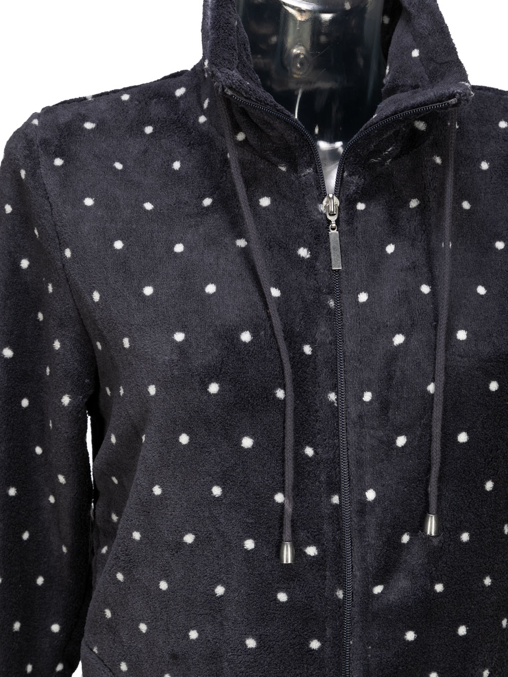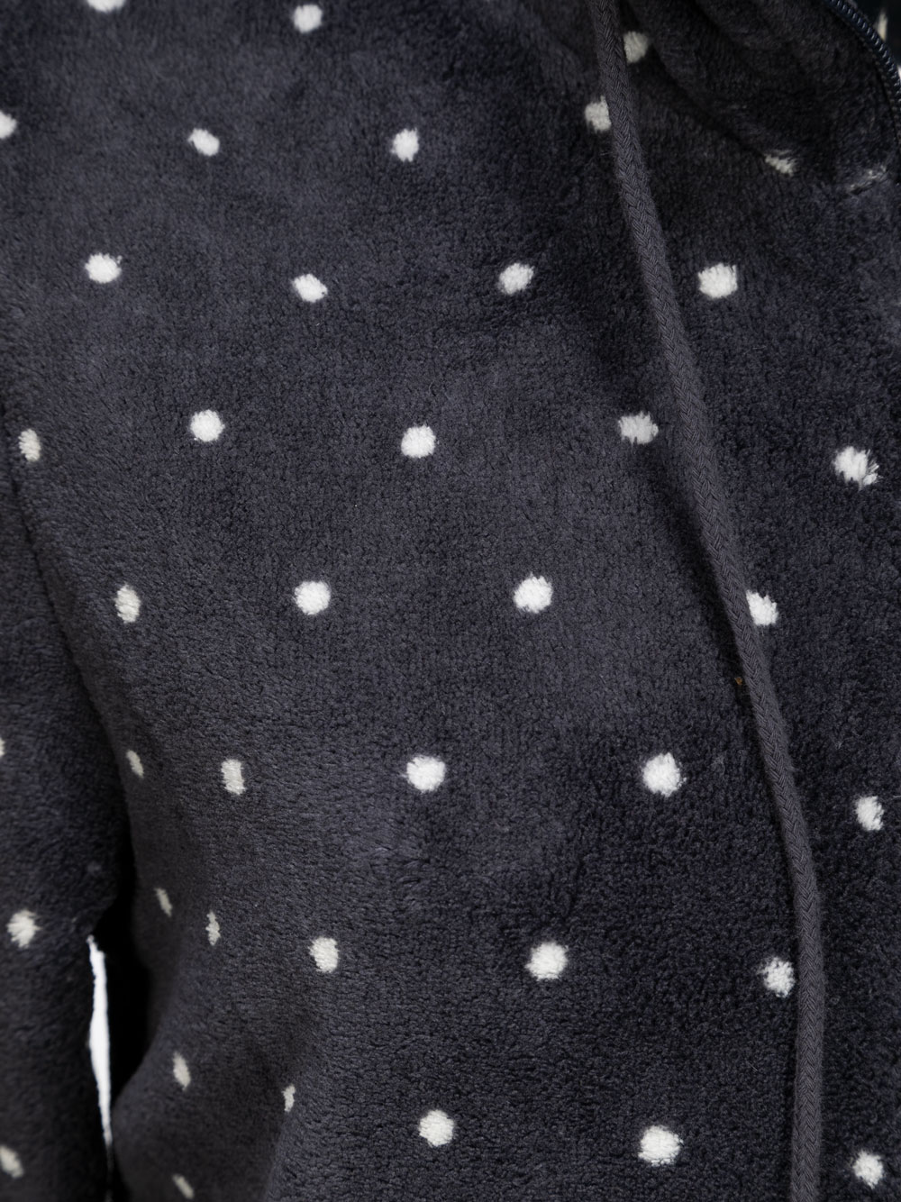 Tuta casa anche esternabile grigia plumbeo donna composta da: giacca a pois in caldissimo coral effetto pellicciotto, zip sul davanti, collo alto con laccetto regolabile, manica dritta, tasche laterali, forma dritta sul fondo; pantalone stile tuta in cotone più leggero, linea comoda, arricciato in vita, semi-dritto sul fondo, no polsino.