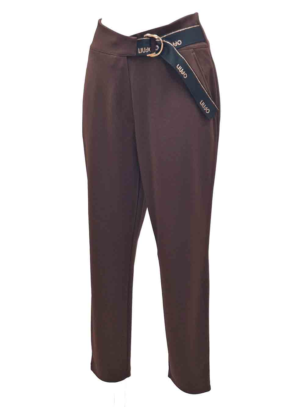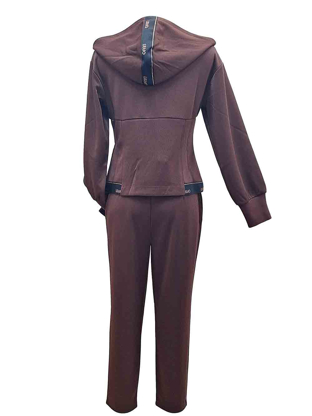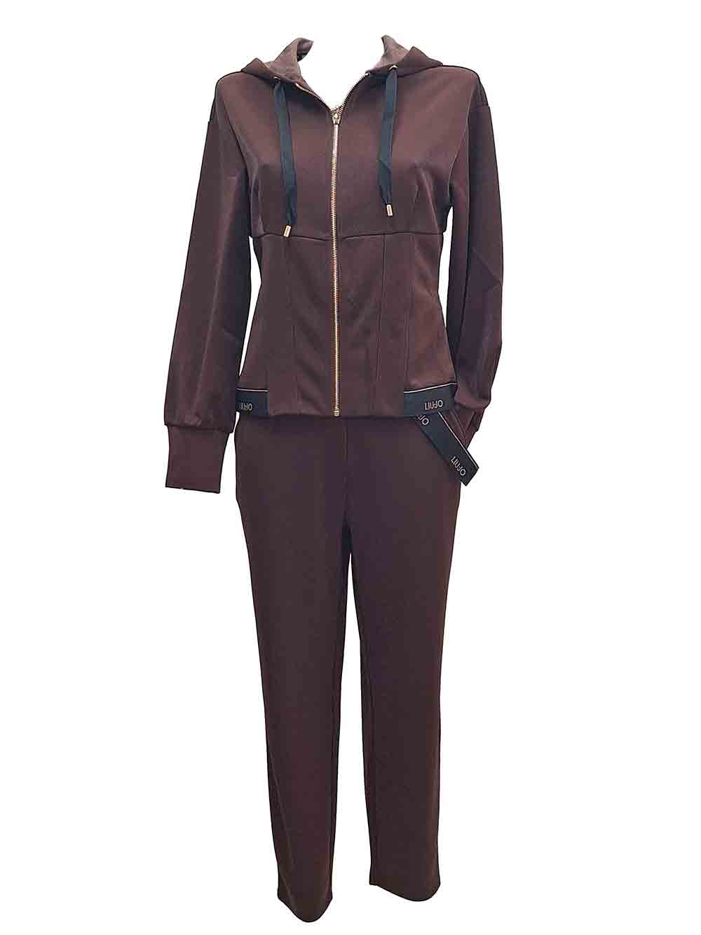 Tuta sport donna color marrone cioccolato in tessuto/jersey fermo con lavorazione miropiquet leggermente lucido e scivoloso composta da: giubbottino con zip centrale oro rosato più pendente gioiello, cappuccio con coulisse, forma modellata, sul fondo laterale applicazione di spighetta nera con logo dorato, manica con polsino alto finale; pantalone regolare (no tuta), vita alta, fascia modellata in punto vita con rifinitura cintura laterale con rifiniture oro e nere, tasche laterali obliquea vista, va a stringere sul fondo.