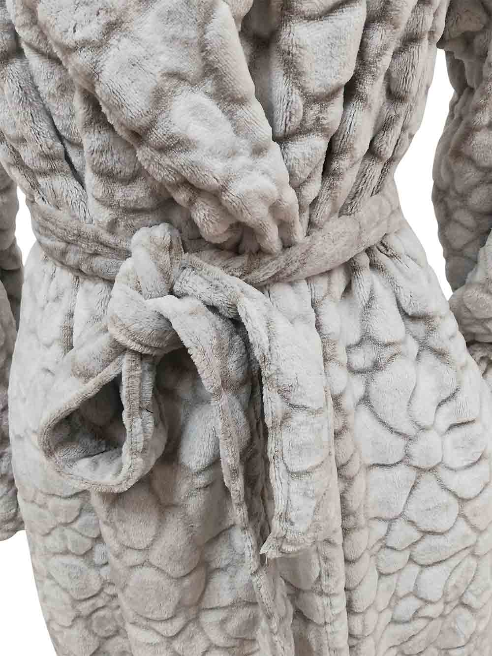 Vestaglia donna in morbidissimo e caldo coral effetto pellicciotto, pelo interno, fantasia devoré floreal/animalier sui toni del tortora/grigio perla, collo ricco sciallato, forma sovrapposta, cintura con laccetti per chiudere punto vita, tasche laterali invisibili, lunghezza metà gambe.